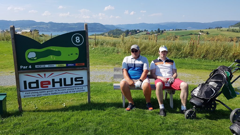 Det var en meget varm dag på Byneset, men takket være en god vind var det fint å spille. Her er det Arthur Melling og Tor Helge Taagvold som tar seg en liten pause på benken ved utslaget på hull 8.