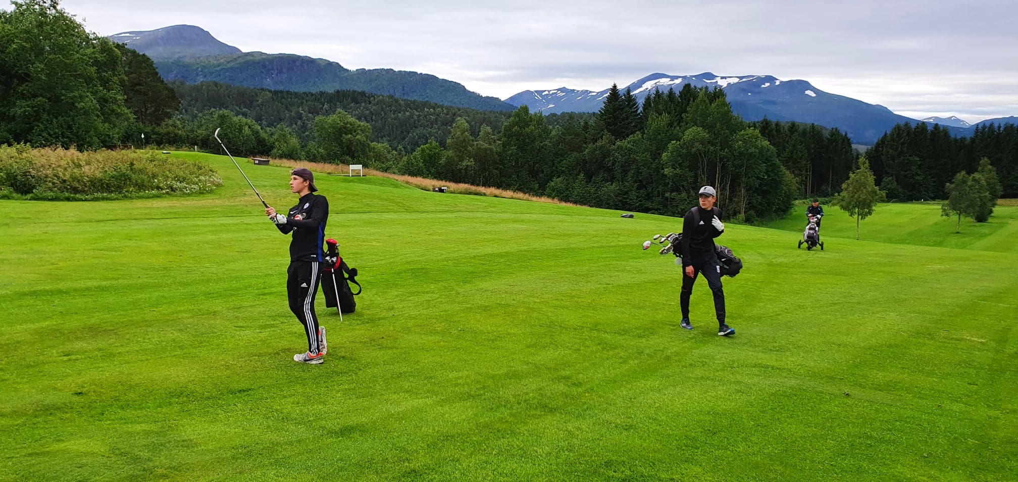 Malin Røen og Lasse Vaseng Hansen vant hver sin klasse på meget overbevisende måte.   Her slår Lasse inn mot greenen på hull 6, med turneringsdebutant Eirik Vang Aas som tilskuer bak.