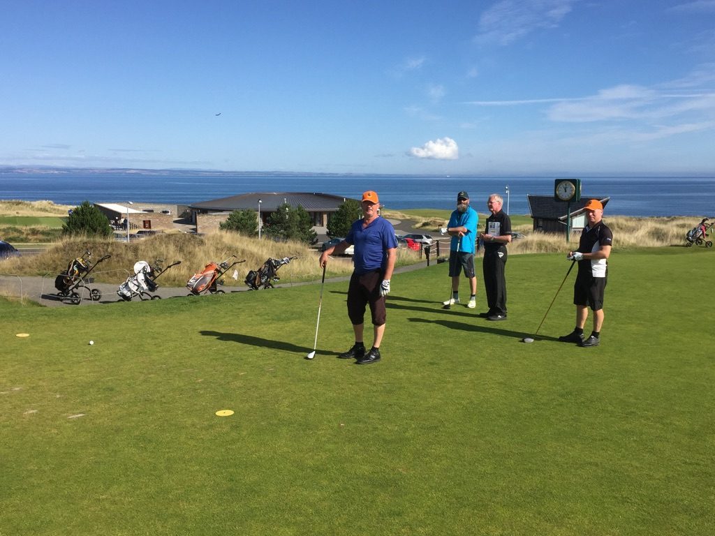 Her er vi kommet til Castle Course. En helt fantastisk bane iflg. Geir. Skikkelig links-bane. Og været er også helt upåklagelig denne dagen som vi ser. Her er Gartes reisevenner klar for utslag på hull 1.