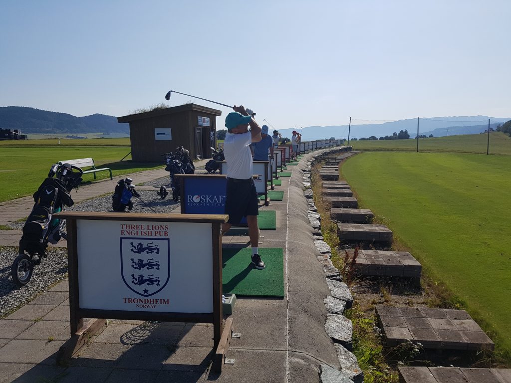 Selv om sola steiker og temperaturen passerer 30 grader må det selvfølgelig oppvarming til å for myke opp stive golfkropper før vi starter 🙂
