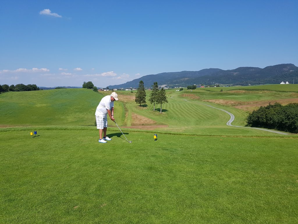Helge Wiig viser fin svingteknikk på hull 5.