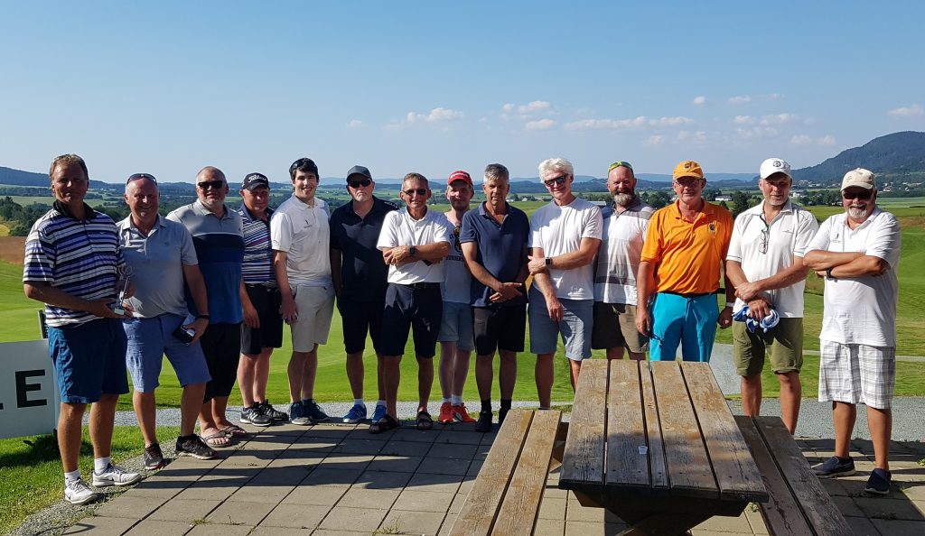 Her er hele gjengen  som deltok i årets turnering samlet ved klubbhuset etter middag og premieutdeling.   Fra venstre Allan Troelsen, Knut Haugen, Arthur Melling, Geir Pedersen, Tor Helge Taagvold, Sturla Solheim, Hallvard Kvande, Erlend Steinshamn, Jørn Einar Bjørnaas, Helge Wiig, Stig Talgø, Geir Berntsen, Arne O. Sæter og Jan Ove Bævre.