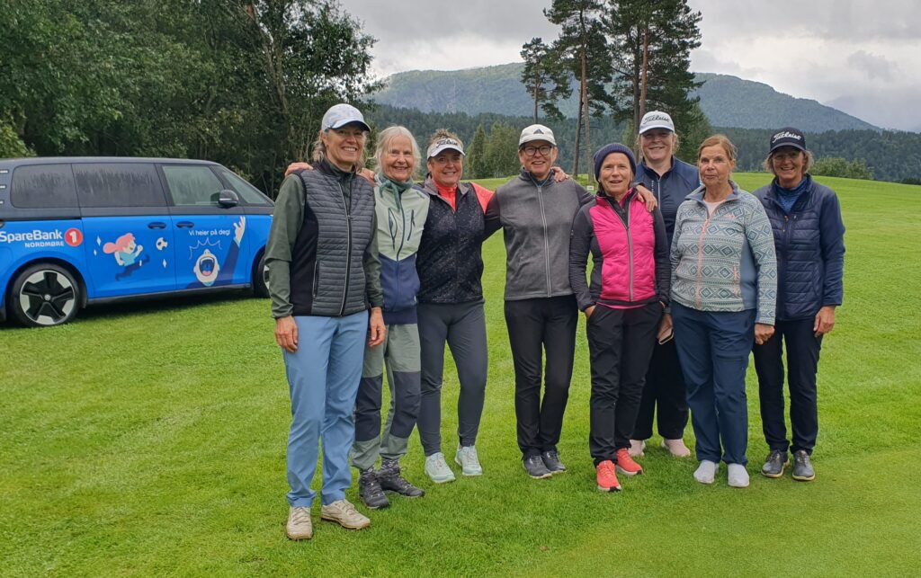 Det er svært så sjelden vi har hele 8 damespillere på startstreken i en golfturnering på Surnadal Golfpark, og kanskje var vi faktisk vitne til en historisk rekord i SpareBank 1 Nordmøre Open i dag. Fra venstre Linnea Olsen Løkberg, Mette Lassen Buchholz, Heid Snekvik, Kari Lise Kongshaug, May Britt Berild Rønes, Jorunn Kristin Berget, Oddny Marie Johnsen Mokkelbost og Tove Hilstad Garte.