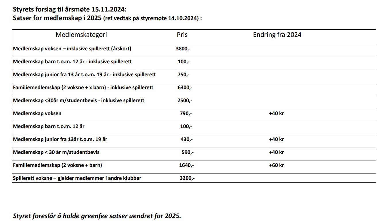 Det formelle årsmøtet var unnagjort på et kvarters tid, der styret la fram sitt forslag til medlemskontingenter – som årsmøtet vedtok enstemmig.  Prisene for spillerett på banen blir uendret fra 2024, mens det er mindre justering av medlemskontingentene.  Her er satsene: