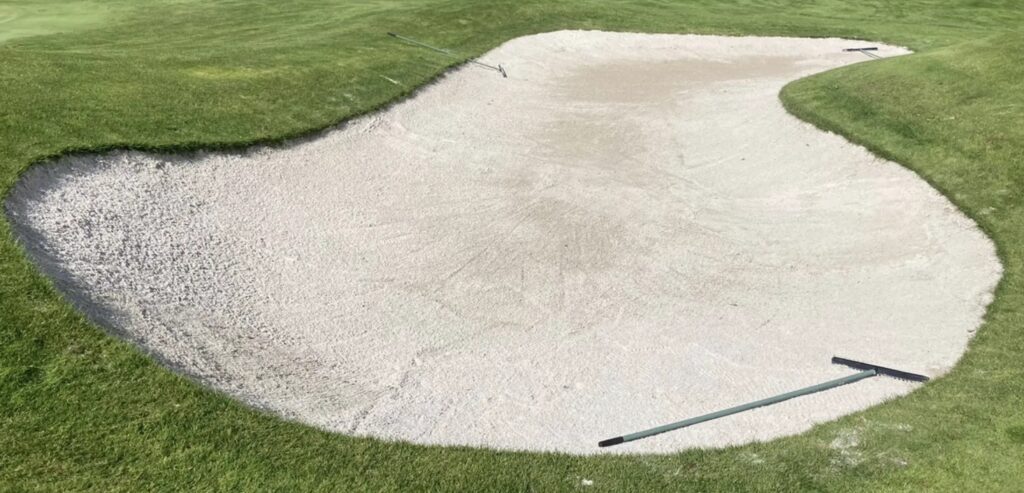 Bunkersanden må vi nå frakte ut til de enkelte bunkerne – og planeres/rakes ut. Men aller først må vi ha hjelp fra en dugnadsgjeng som skal renskjære bunkerkantene før den nye sanden kan legges ut.