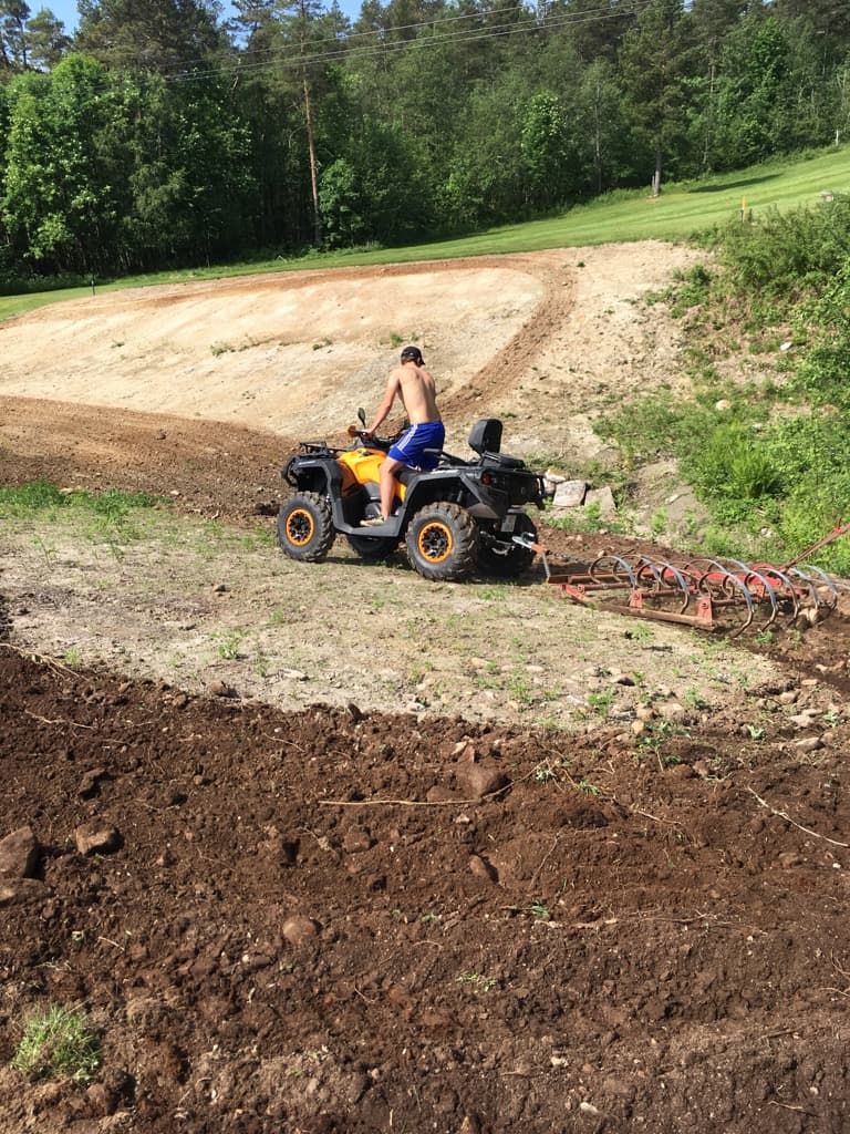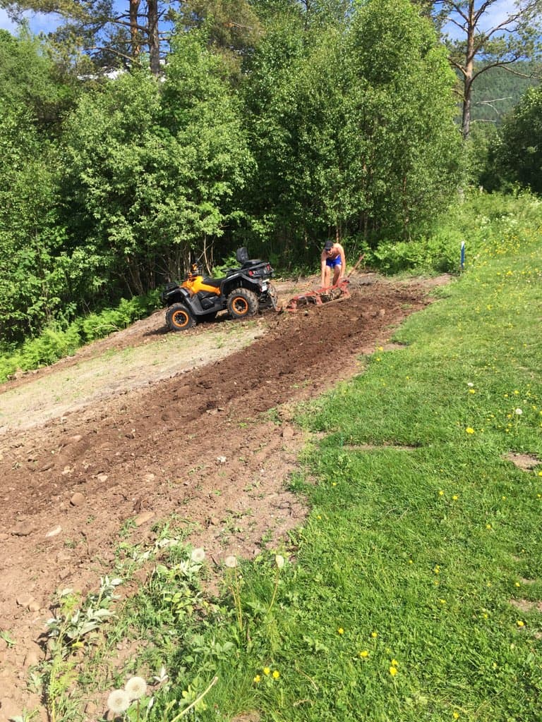 I dag har Kristian Ansnes gjort unna den maskinelle delen av arbeidet, med horv bak firhjulingen.