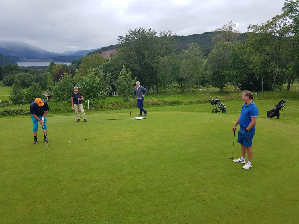 Her er det Geir Berntsen (i orange caps) som putter, mens Dagrun Dyrnes Stromberg, Reinhard Wichmann og Allan Troelsen følger med. Allan er trolig den som har vært mest aktiv av alle på banen denne helga – med hele 8 runder i løpet av lørdag og søndag. Hvem kan rapportere om flere enn 72 hull i løpet av helga ?? 🙂 Han spilte forøvrig en av søndagens runder på banens par – meget sterkt!