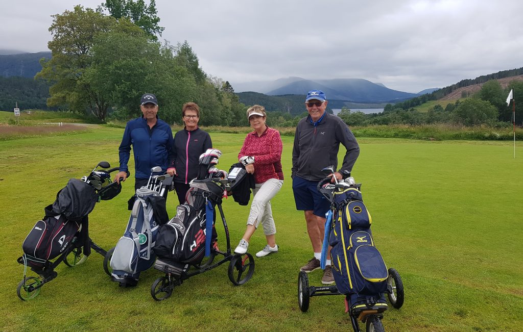 Her er det kjekk gjeng som nettopp har gjort unna sin runde på hull 9. Fra venstre Jørn Einar Bjørnaas, Maja Kjerstad Bjørnaas, Laila Eriksen Østbø og Kjell Øyen.