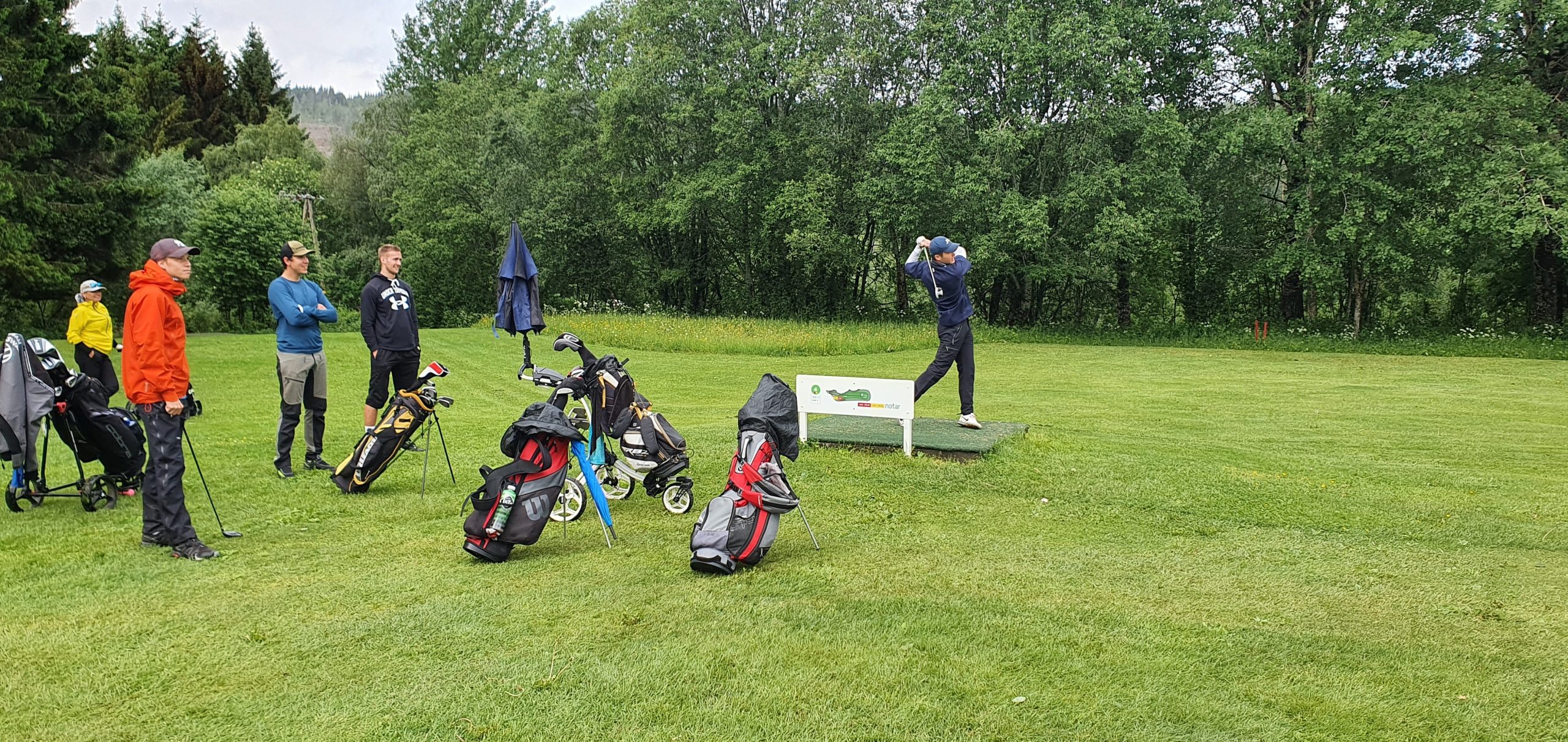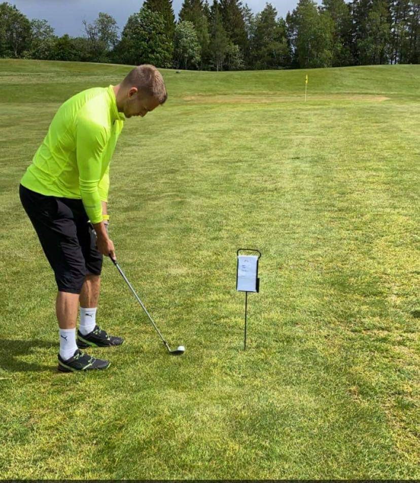 Her er det Andreas Dalsegg Sæter som slår andreslaget mot greenen på hull 6, for sitt lag «The Fab foooore!». Hans lagkamerat Torstein Snekvik fikk stjernetreff på utslaget – og fikk også premien for longest drive i herreklassen.