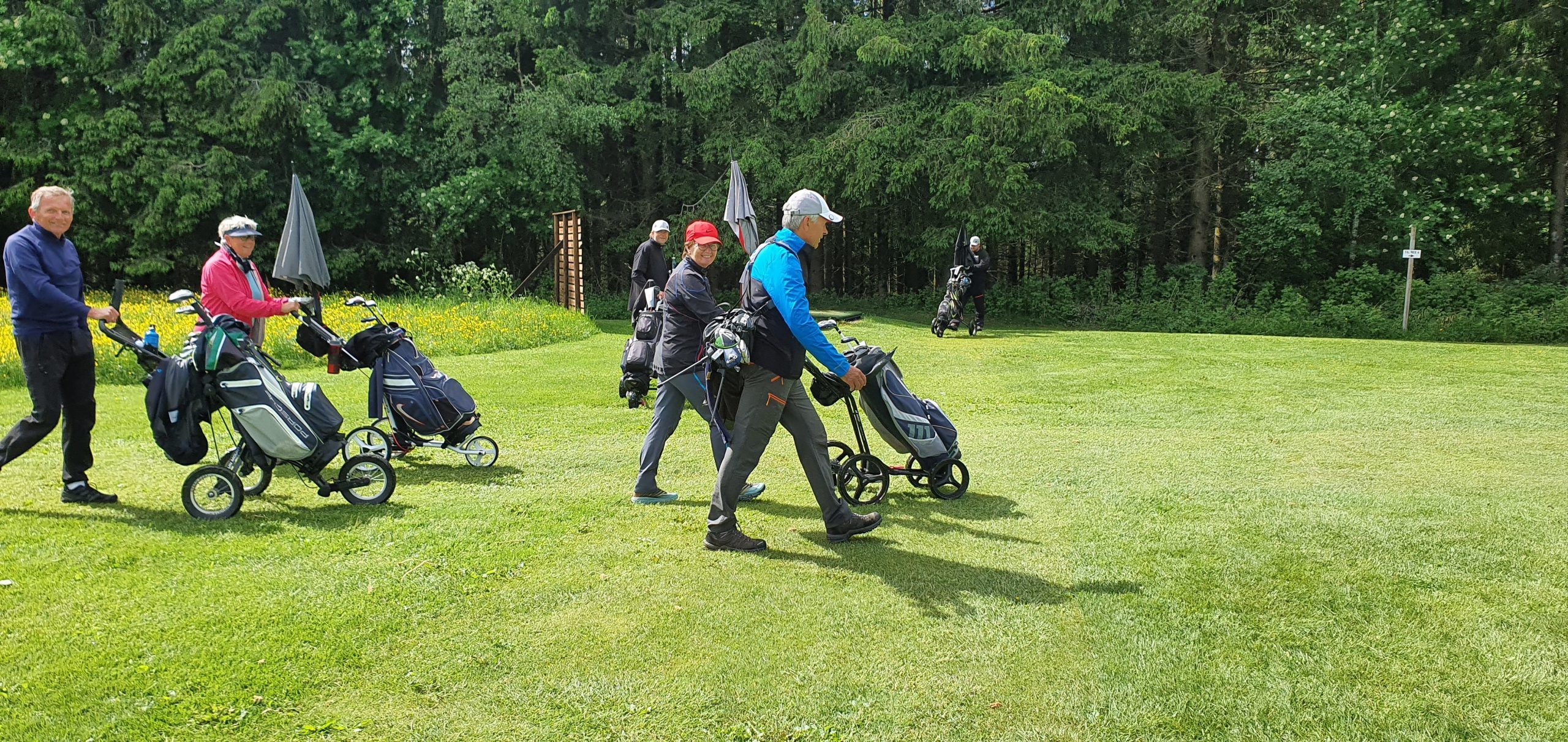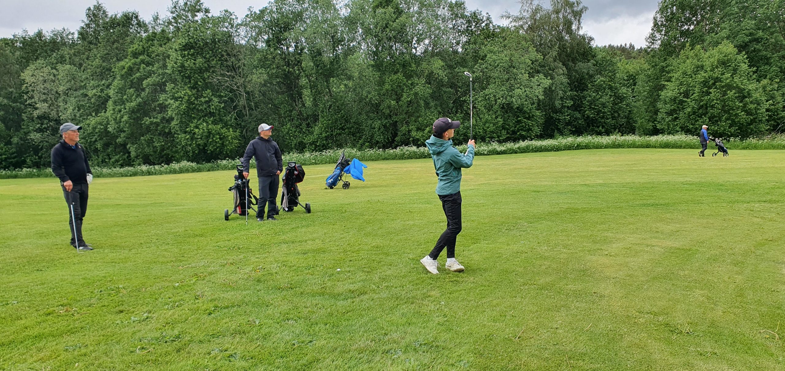 Her er det «Team Kvande» som spiller seg framover mot greenen på hull 4. Lagets yngstemann Marius Kvande slår, mens bestefar Terje, far Tom Erik og Jens Settemsdal (i bakgrunnen) er spente på resultatet.