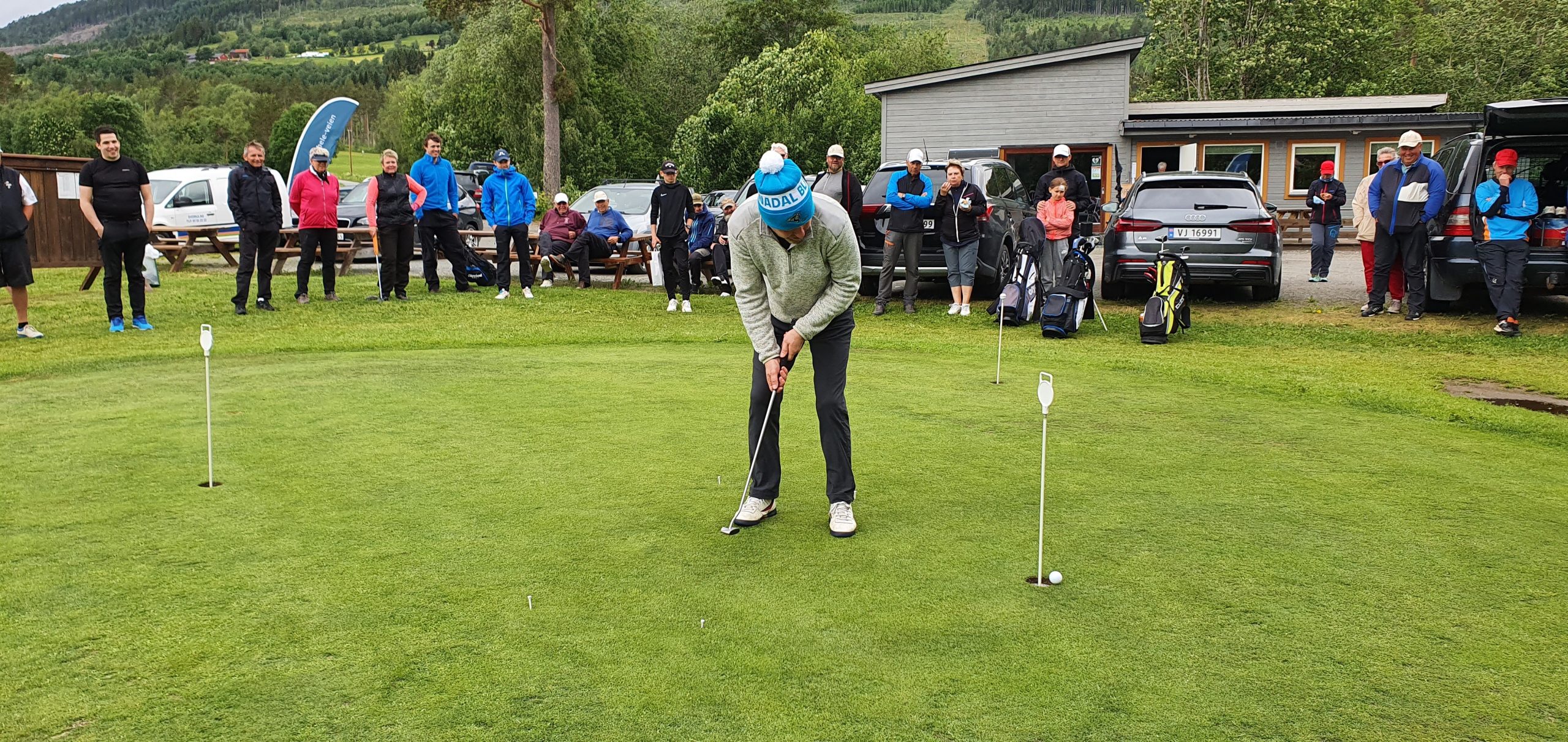 Spennende for publikum og stort press på spillerne da «Gartes» og «Snekvikbanden & Knut» måtte til puttekonkurranse for å avgjøre plassene på seierspallen. Her er det Knut Bergli som putter, og……? 🙂