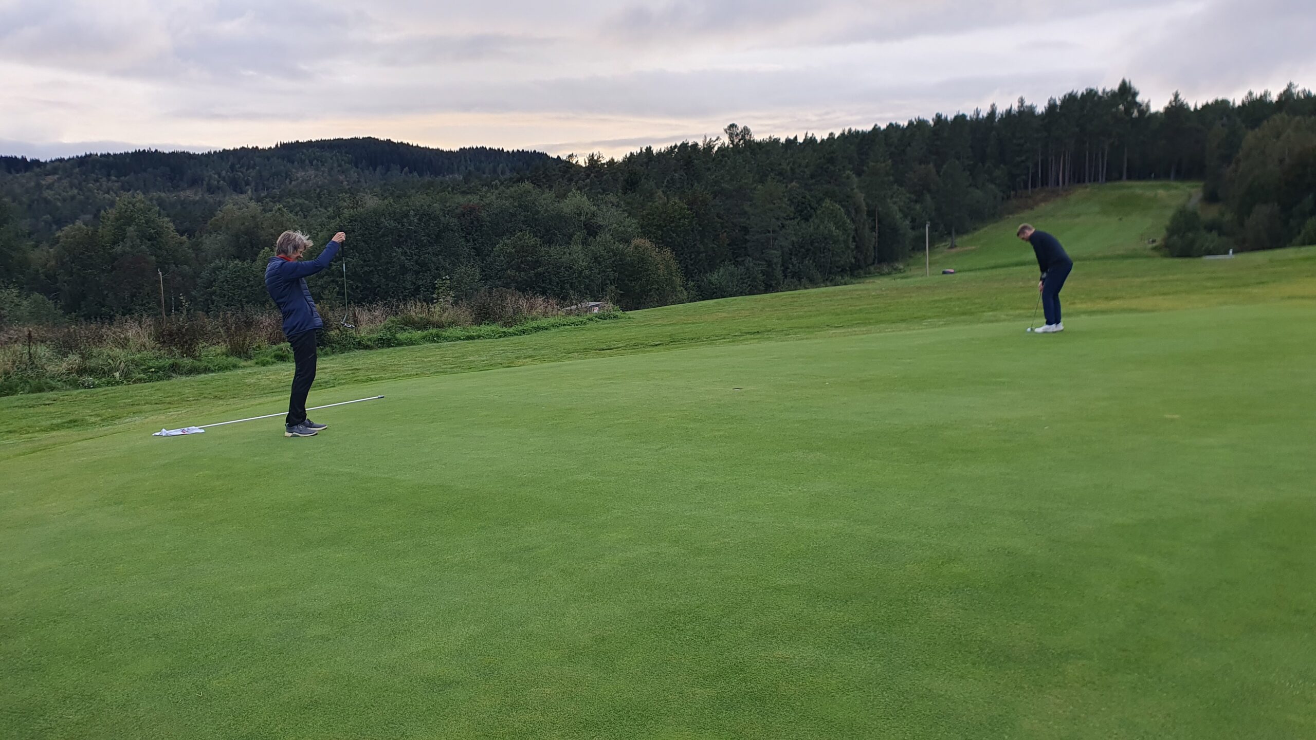 Tove Hilstad Garte spilte som vanlig solid golf, og iflg. hennes medspillere var Tove svært presis med putteren i kveld. Her ser vi Tove i gang med sine forberedelser, samtidig som Vegard Bredesen putter. Dessverre ble det en hårfin bom her på hull 18 for Tove, men sikret seg likevel 19 poeng og rundeseier..