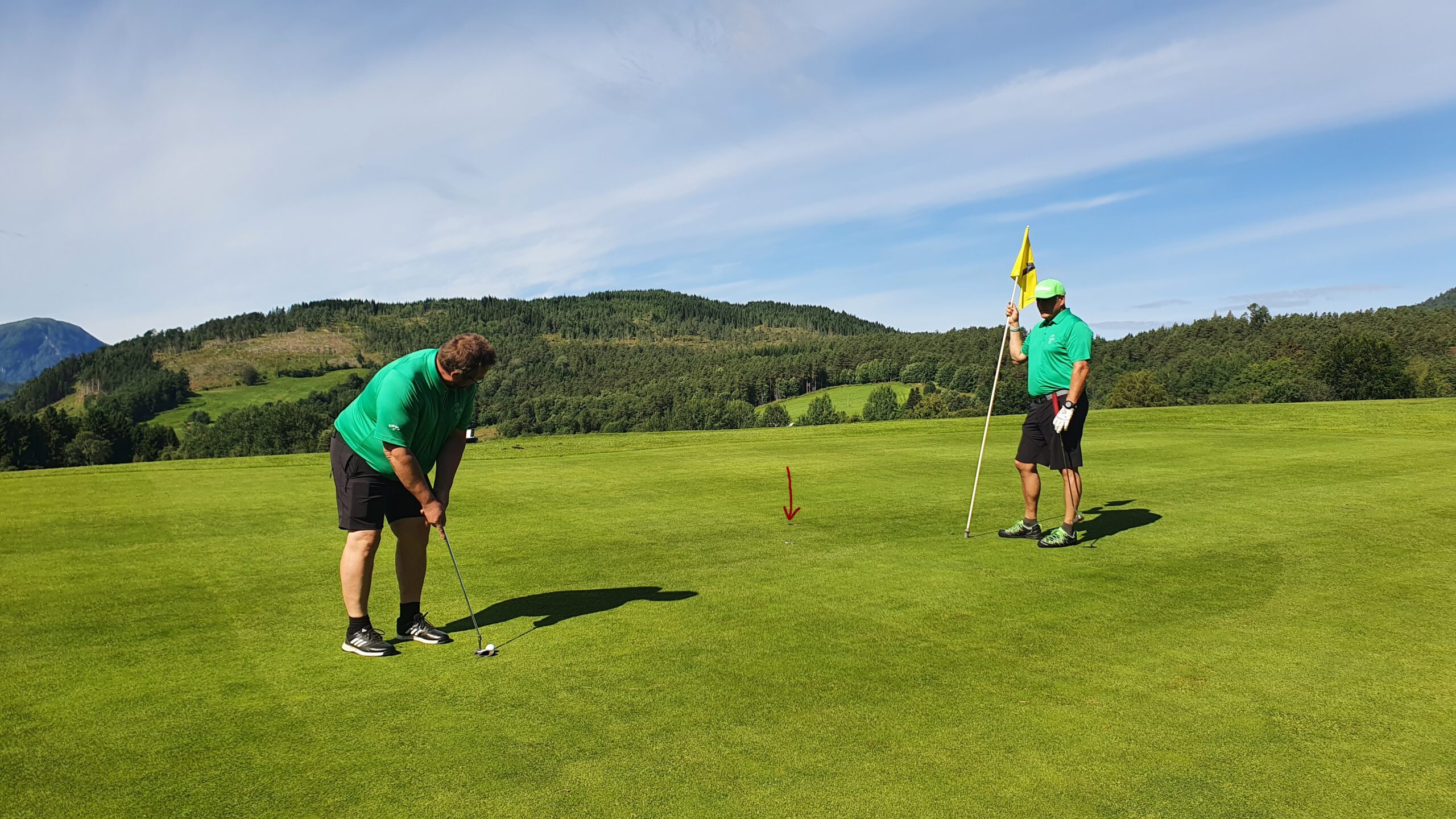 Siri Vaagland chipper inn mot greenen på hull 7, mens Geir Berntsen er tilskuer bak. Laget «Team Berntsen» endte på 3. plass til slutt.