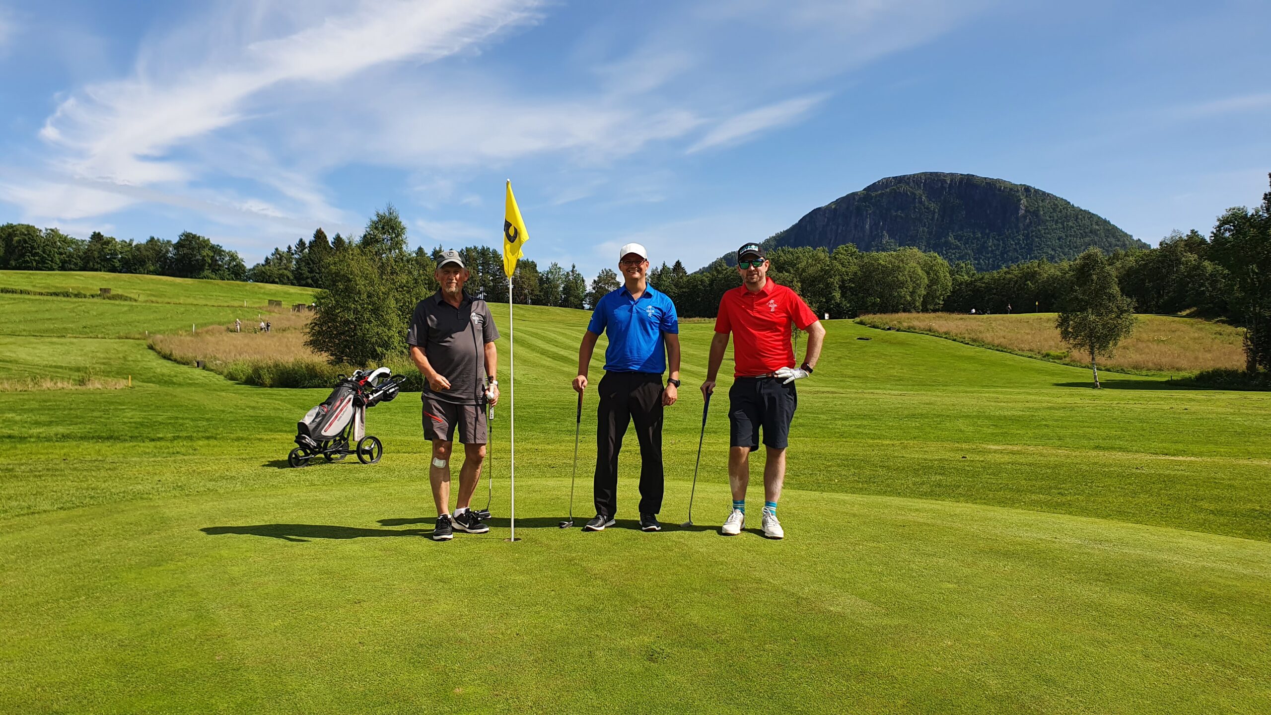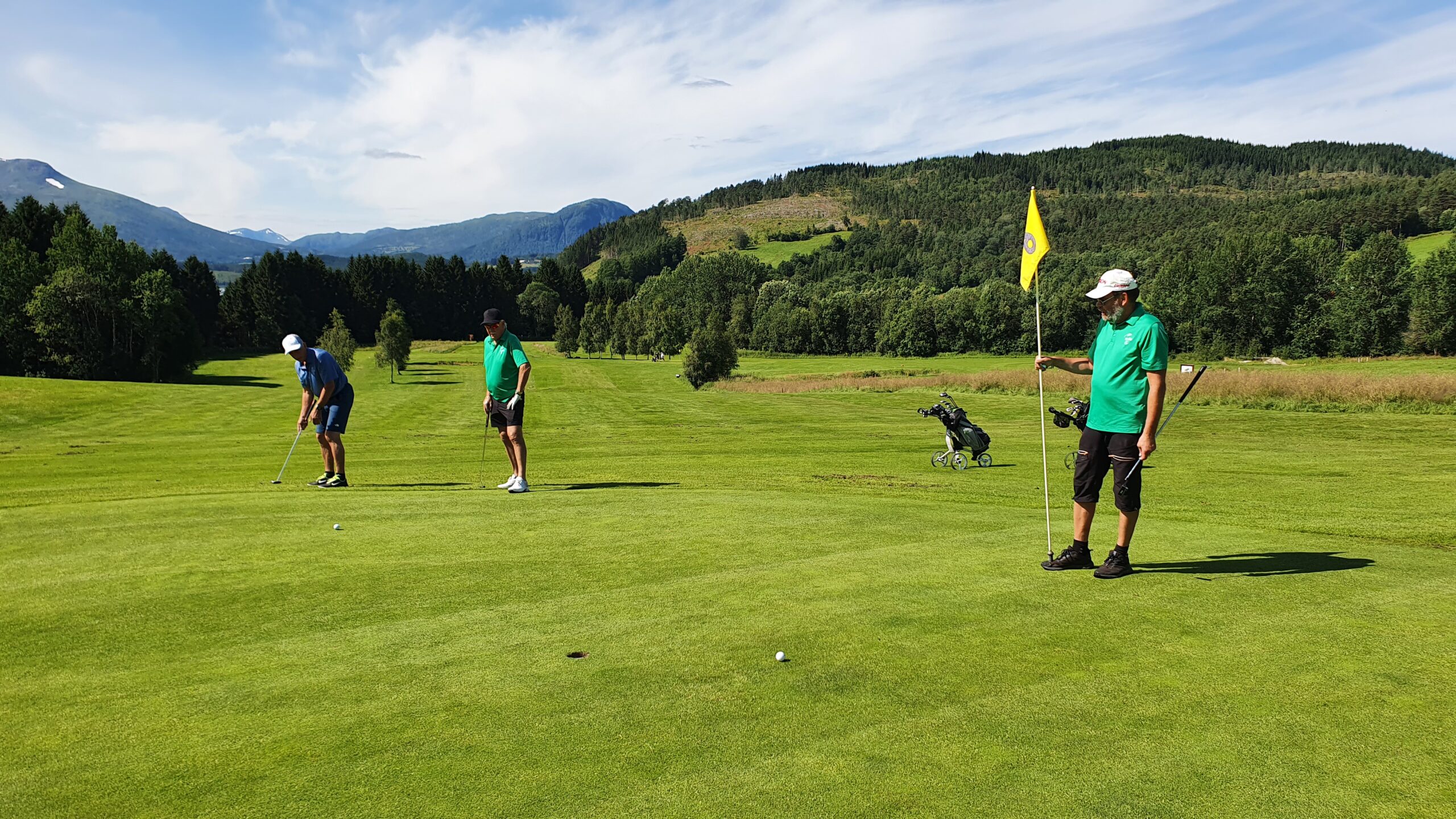 Her er laget «Fairway Kings» på hull 6. Nils Magne Røen putter, mens medspillere Palmar Brennskag og Geir Forbregd følger med.