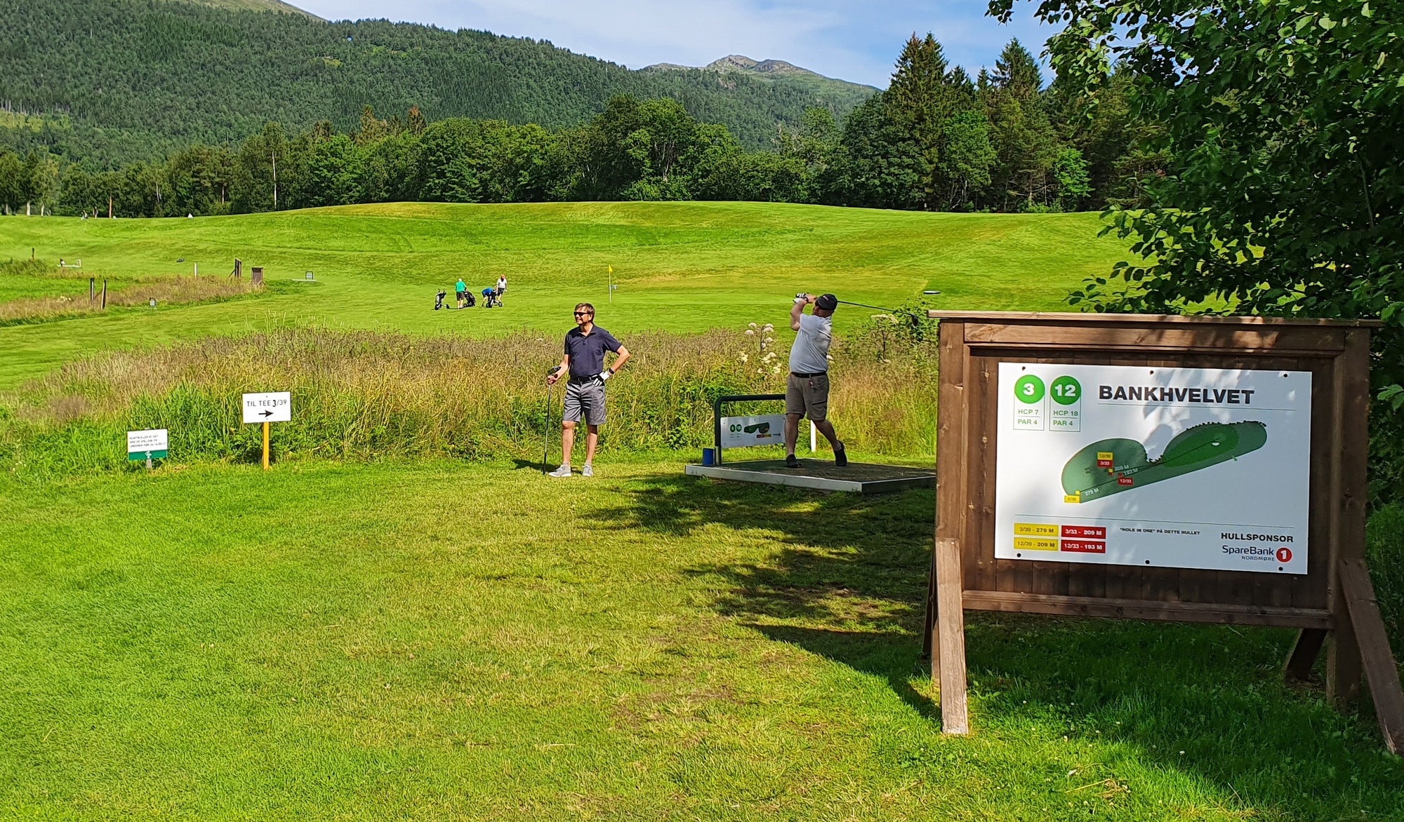 Det var også noen gjestespillere med i Pipelife Mexican Scramble, både fra Sunndal GK, Stjørdal GK og Klæbu GK. Her er det (linksspiller) Gisle Stølen fra Klæbu GK som slår ut på hull 3, med klubbkamerat Hans Christian Bolstad følger med ballen.