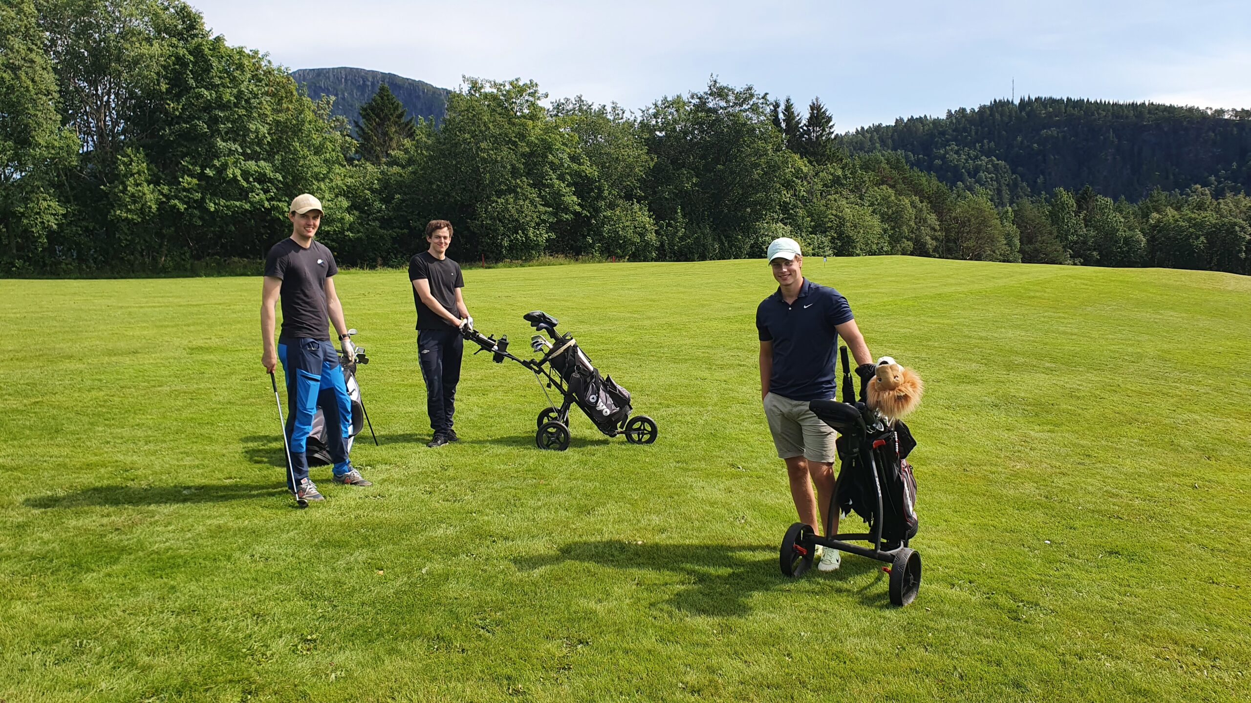 Spillerne er klare til start i vår uhøytidelige sommerturnering. Mexican scramble fungerer slik at alle 3 slår ut fra tee, deretter slår de to spillerne som ikke spilte den valgte ballen videre, og fortsetter slik til laget har satt ballen i koppen. I tillegg måtte alle spillerne slå 6 tellende utslag fra tee. En artig spilleform, som også gjorde av resultatene svinget ganske mye underveis.