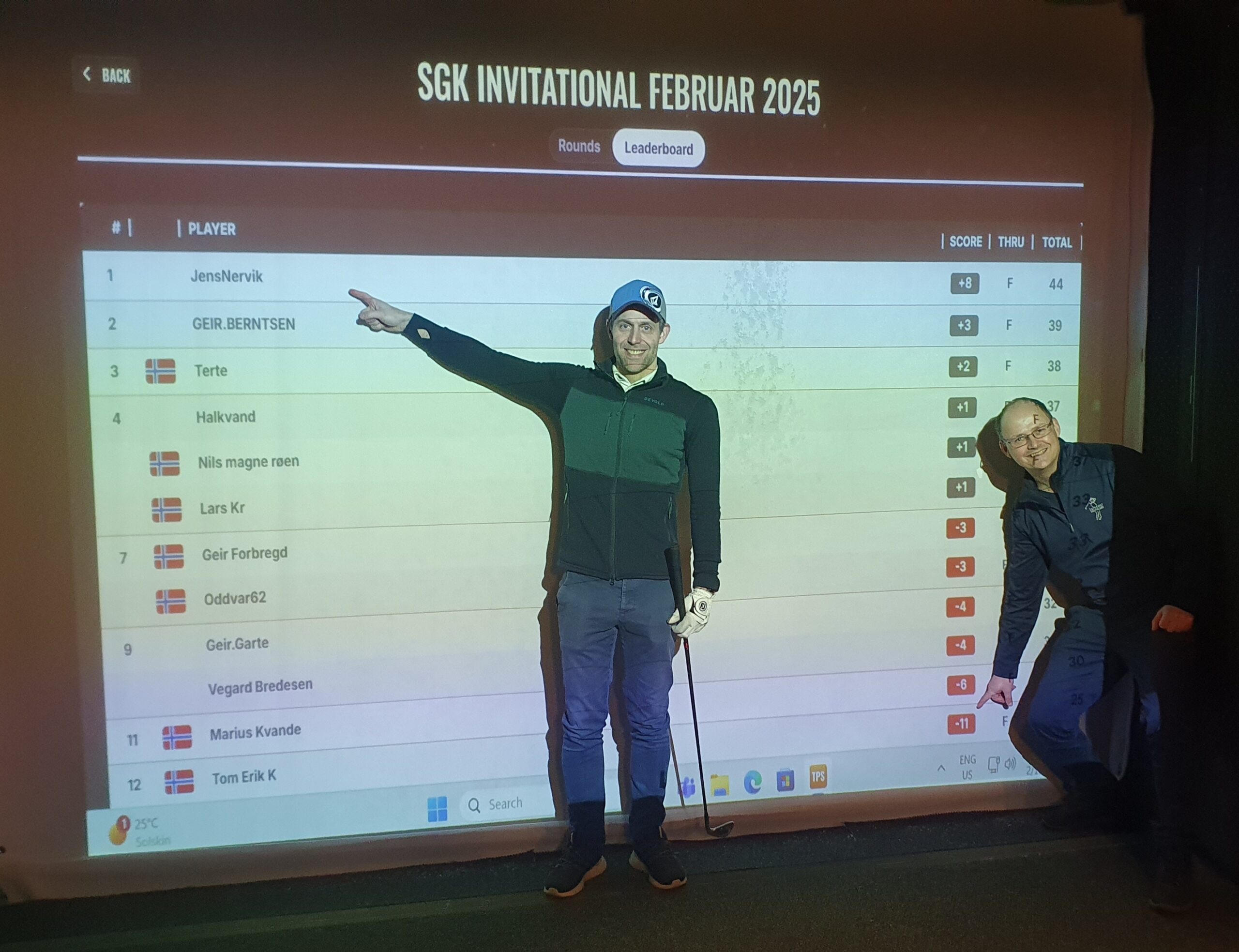 Etter at halve februar er unnagjort har Jens Nervik spilt seg til klar ledelse i klasse 1, mens svigerfar Einar Grønnes har lagt seg i teten klasse 2, i simulatorturneringen SGK Invitational Februar 2025. Turneringen spilles i februar på Lidingö Golfklubb utenfor Stockholm.