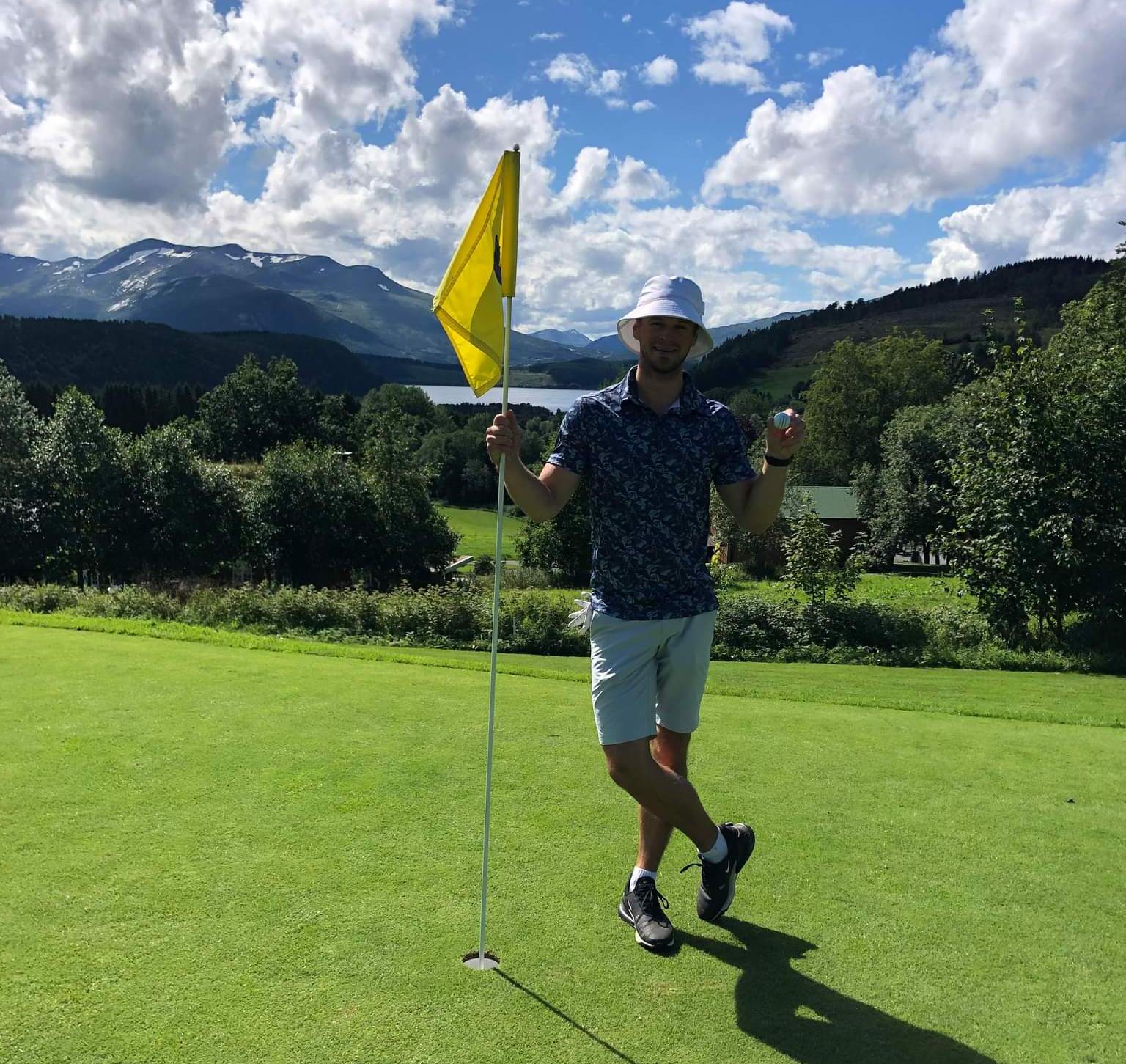 John slo sitt presise utslag med 7er jern. Surnadal Golfklubb gratulerer med prestasjonen ! 🙂