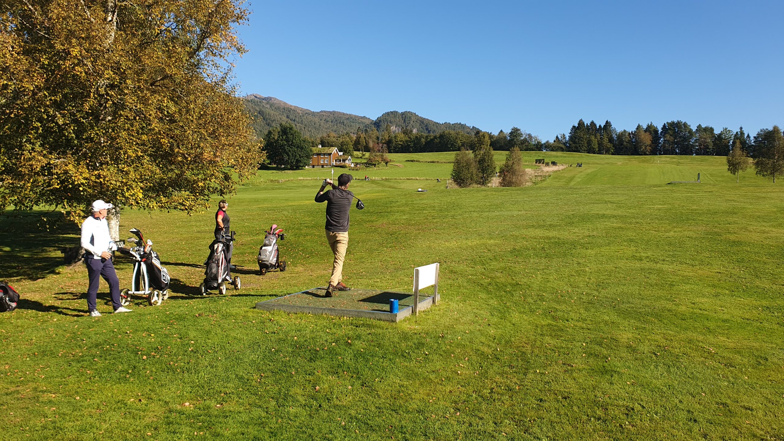 Det var en kjempefin dag på Surnadal Golfpark, men glimrende spilleforhold og nydelig golfvær hele dagen. Her er det Erkki Morten Klami som slår ut på hull 6, mens Ståle Vaag fra Byneset GK (opprinnelig fra Aure) og Heid Snekvik følger med.