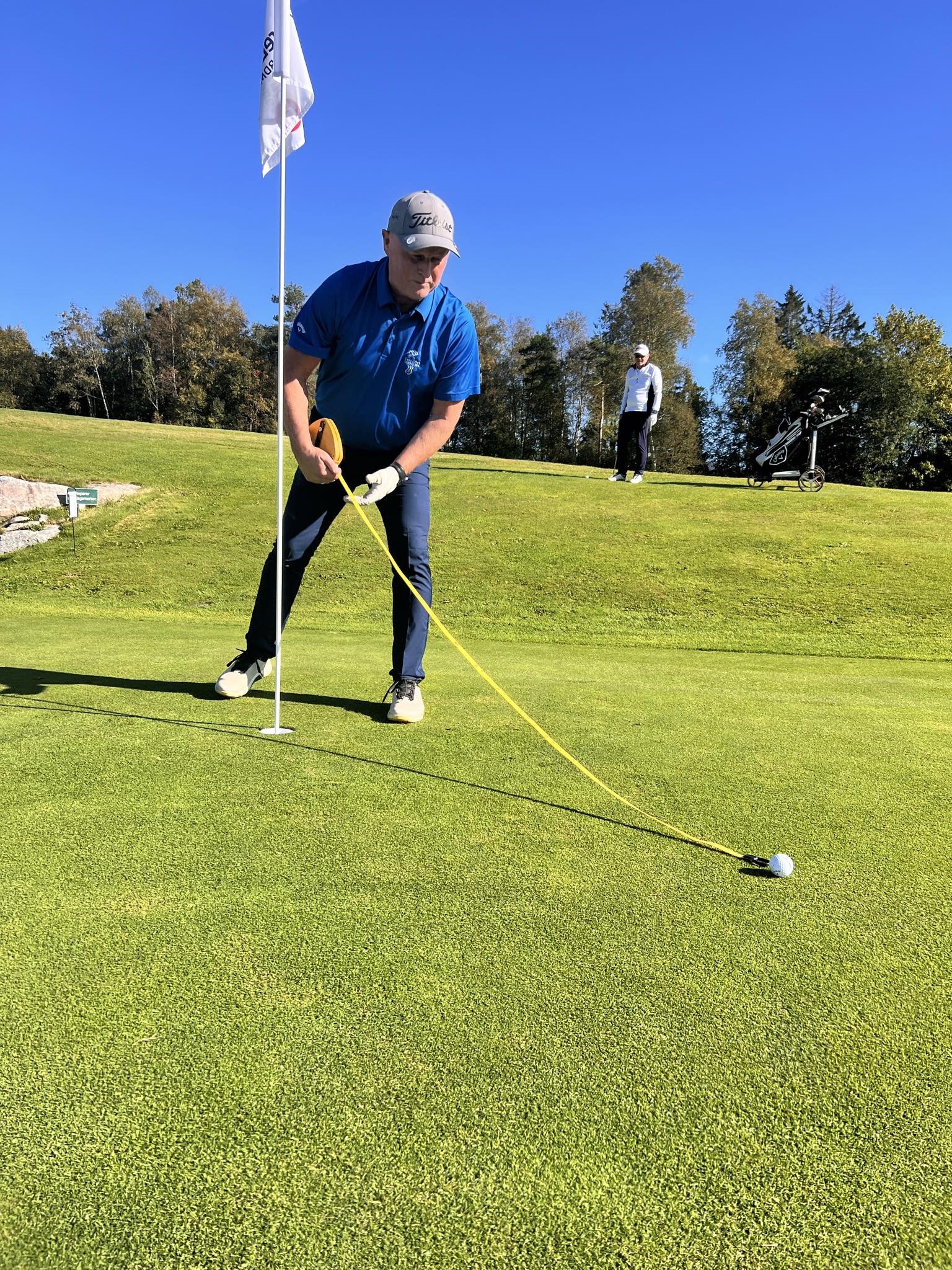 Knut Haugen hadde et håp om å få «nearest to pin» på hull 7 (målbandet viste 1,55 meter), men Karl Fredrik Johannessen kom 22 centimeter nærmere senere i turneringen og sikret seg premien 🙂 Foto: Heid Snekvik.