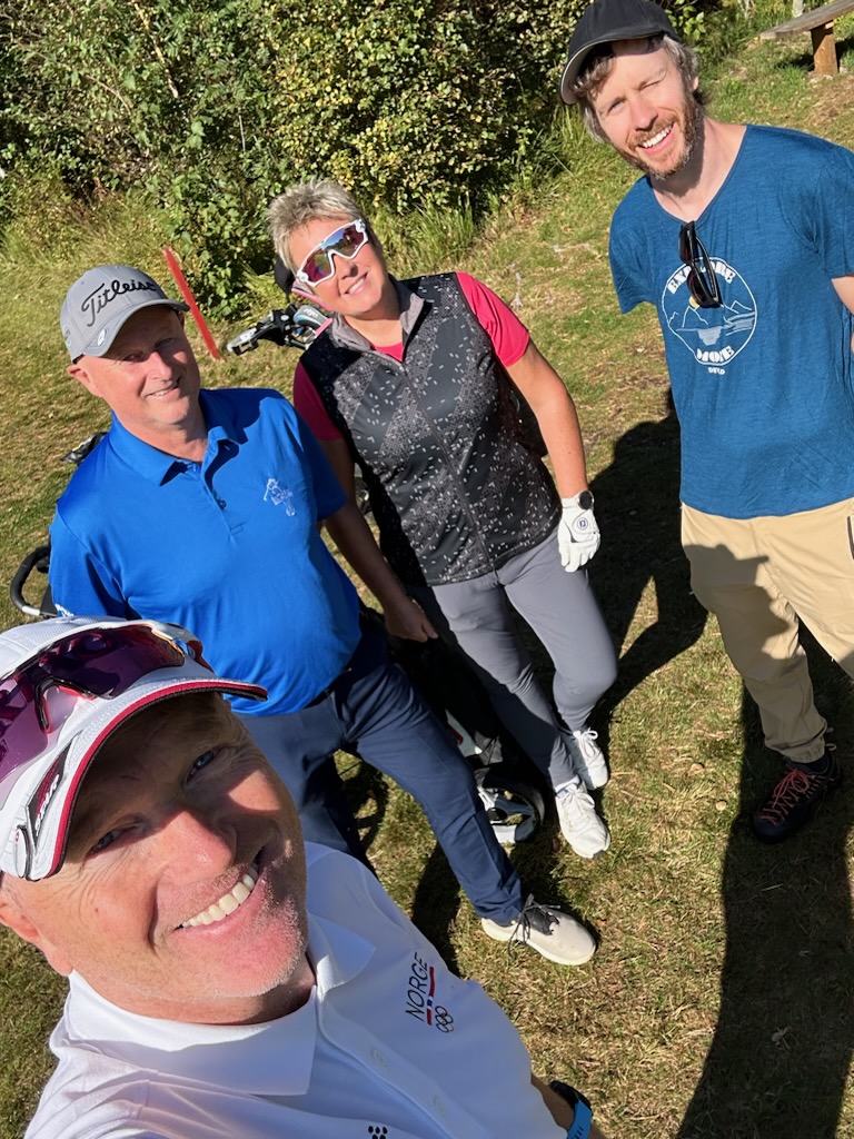 Og er enda flere blide golfere – foran selfie-fotograf Ståle Vaag, og bak fra venstre Knut Haugen, Heid Snekvik og Erkki Morten Klami.