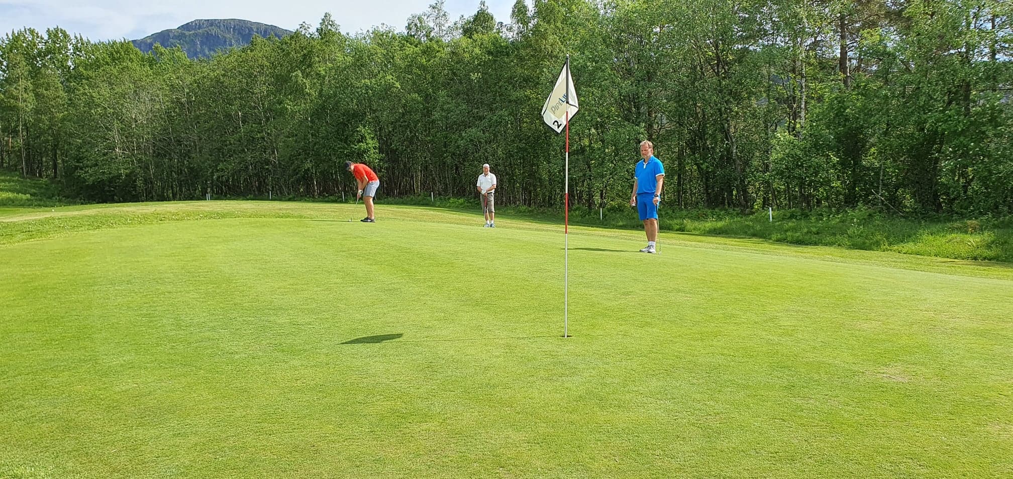 Her er det Kristian Ansnes som putter på hull 2, mens Arne O. Sæter og Allan Troelsen følger med.