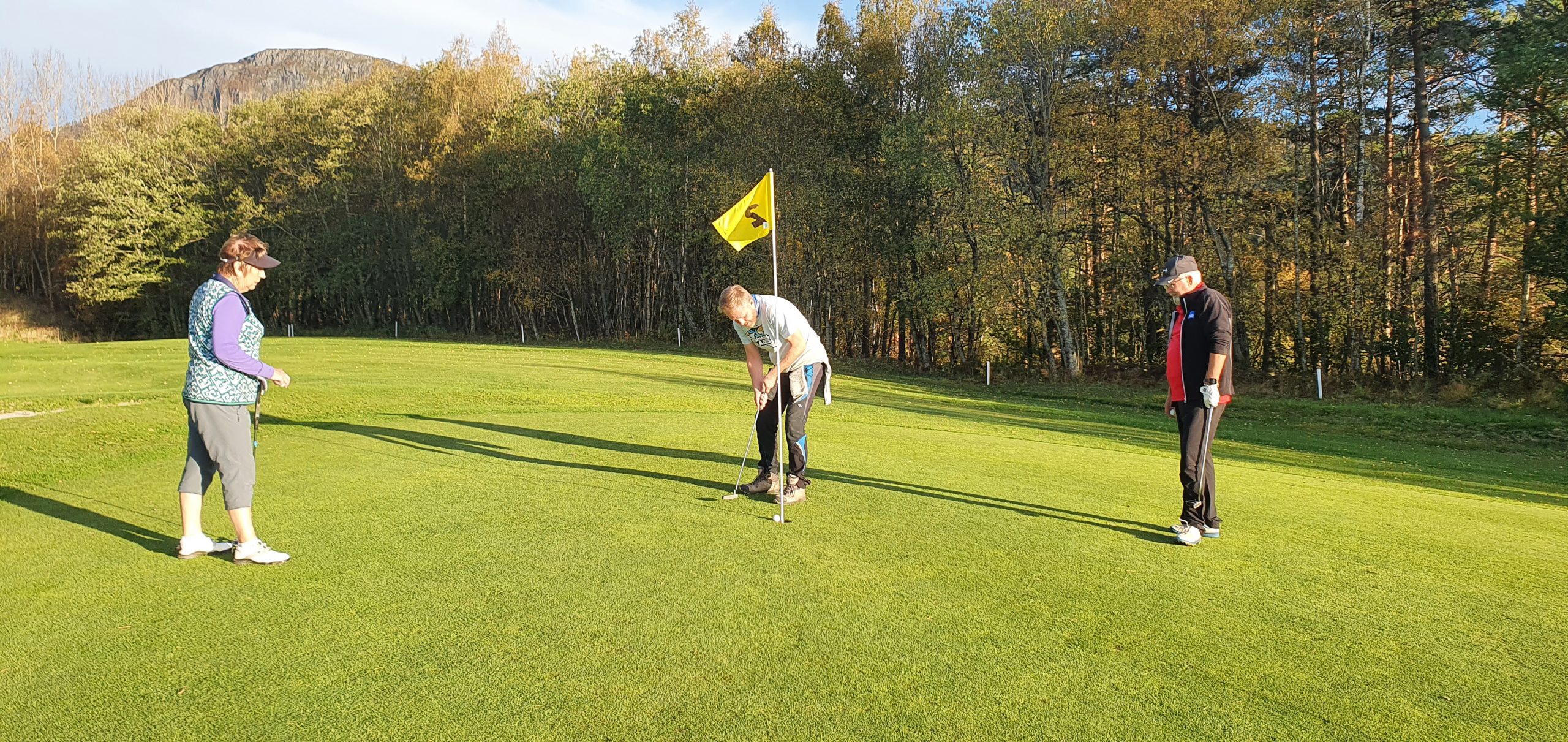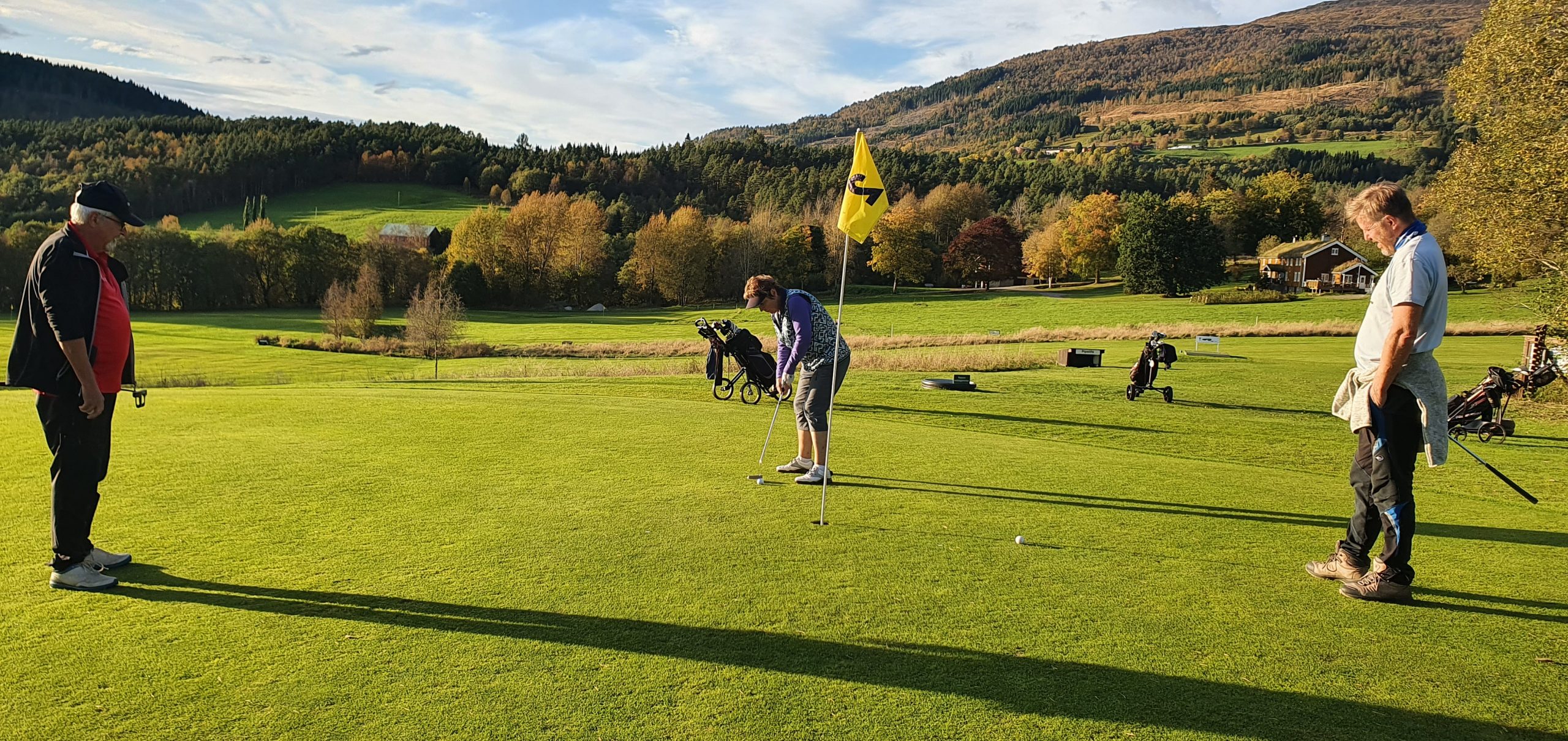 Her er det Laila Eriksen Østbø som putter på hull 11, mens Jan Ove Bævre (til venstre) og Knut Bergli følger med.