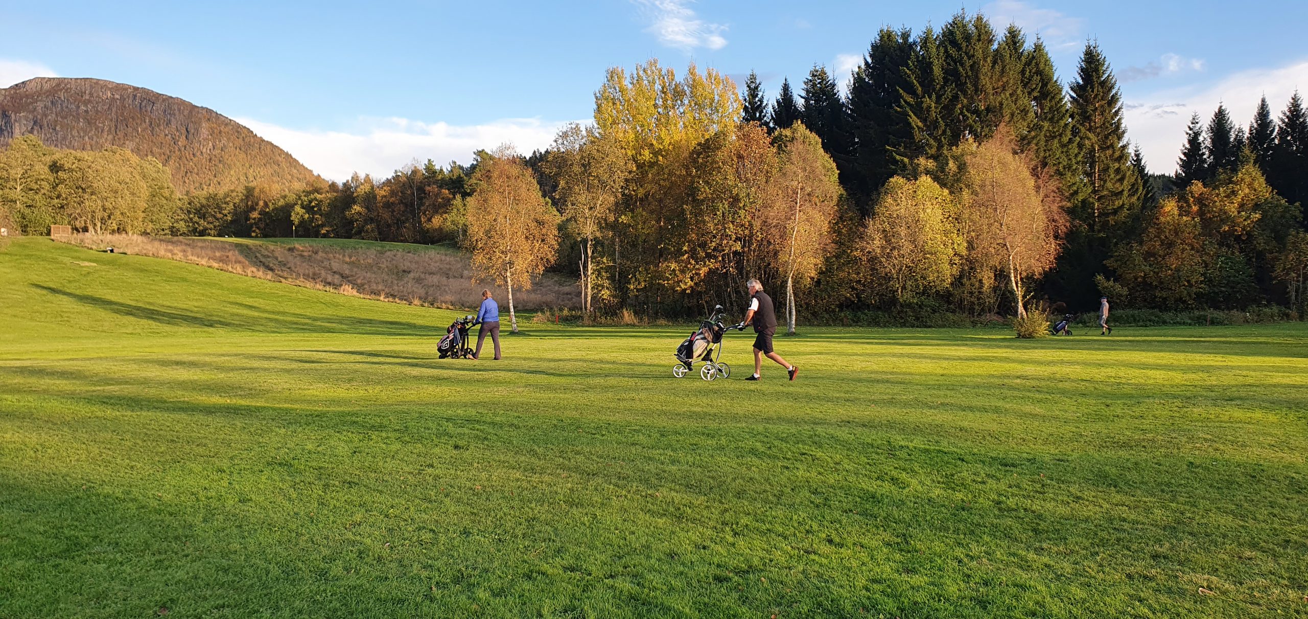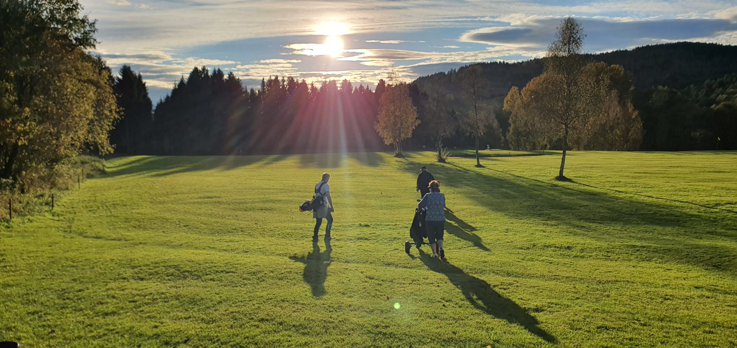 Flott kveld på Surnadal Golfpark, med sol og fine høstfarger. Her ser vi sammenlagtvinner Tove Garte og Palmar Brennskag som går oppover på hull 6.