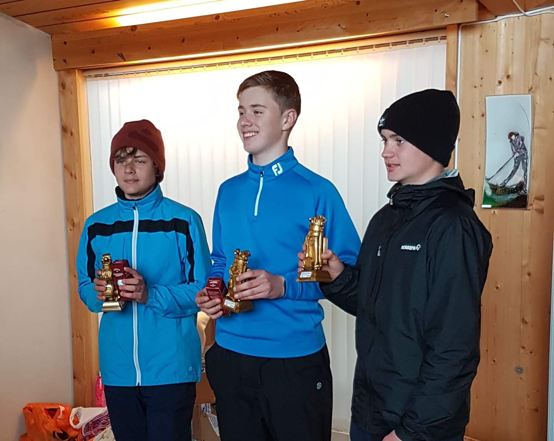 På bildet fra venstre Marius Sjøvik Hjelle (Ålesund GK, nr 6 i brutto og nr 2 i netto), Simon Storsten Dahl (Ålesund GK, nr 1 i både brutto og netto) og Marius Kvande (Surnadal GK, nr 2 brutto og nr 3 netto).
