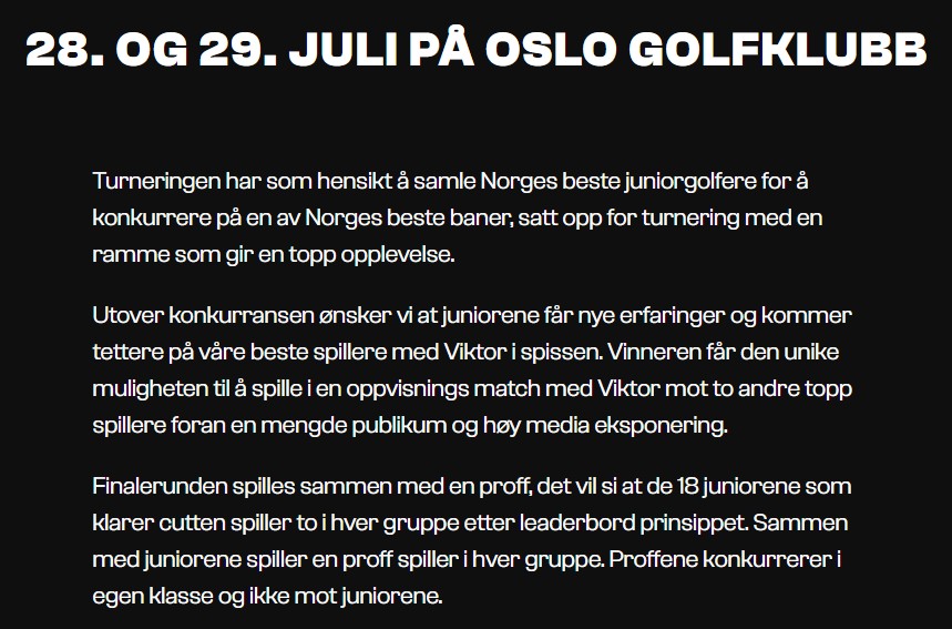 Etter 2 runder a 18 hull mandag, går de 18 beste videre til tirsdagens finalerunde, der også proffene fra NextUp Golf Team deltar. Den junioren som står igjen som vinner etter finalerunden, får en eksklusiv mulighet til å spille på lag med Viktor Hovland i en 9-hulls showmatch senere på dagen.