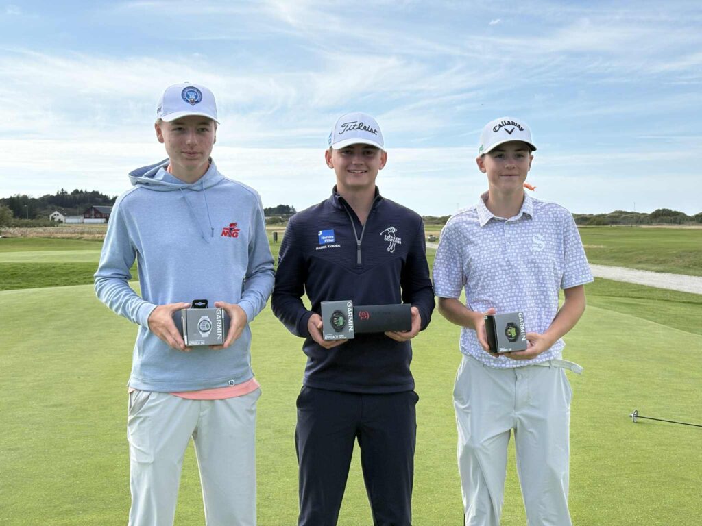 Her er de tre beste i Garmin Norgescup på Solastranden (Sola Golklubb), fra venstre Markus Brandsæter, Bærum GK, Marius Kvande, Surnadal GK og Mathias Aase, Sola GK