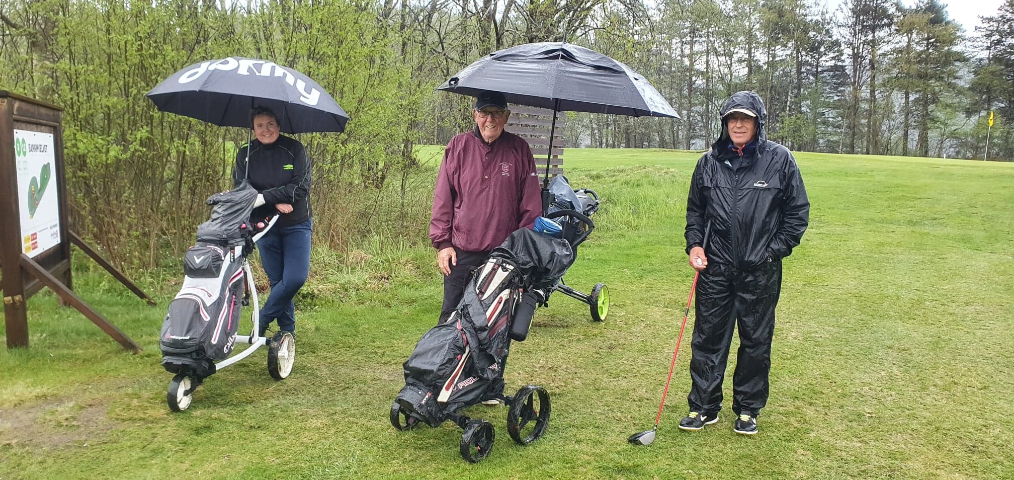 De 19 deltakerne fikk en svært så fuktig kveld på Surnadal Golfpark onsdag, med regnvær i store deler av runden.   Her er det en våt og kald gjeng som står klar ved hull 12 i kveldens runde, fra venstre Heid Snekvik, Kjell Øyen og  Nils Magne Røen.