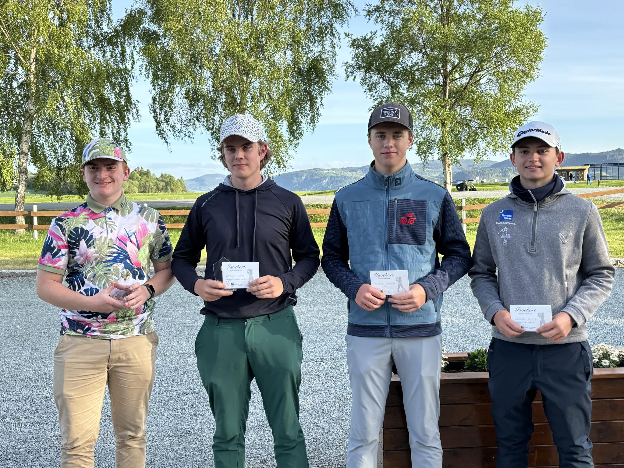 Her er det premierte i dagens runde av Junior Tour, fra venstre: Fillip Berge Sæbø (Stranda GK) 1. plass netto, Leon Hindrum Dahl (Byneset GK), 2. plass netto + 3. plass brutto, Simon Storsten Dahl (Ålesund GK), 1. plass brutto + 3. plass netto og Marius Kvande (Surnadal GK), 2. plass brutto.