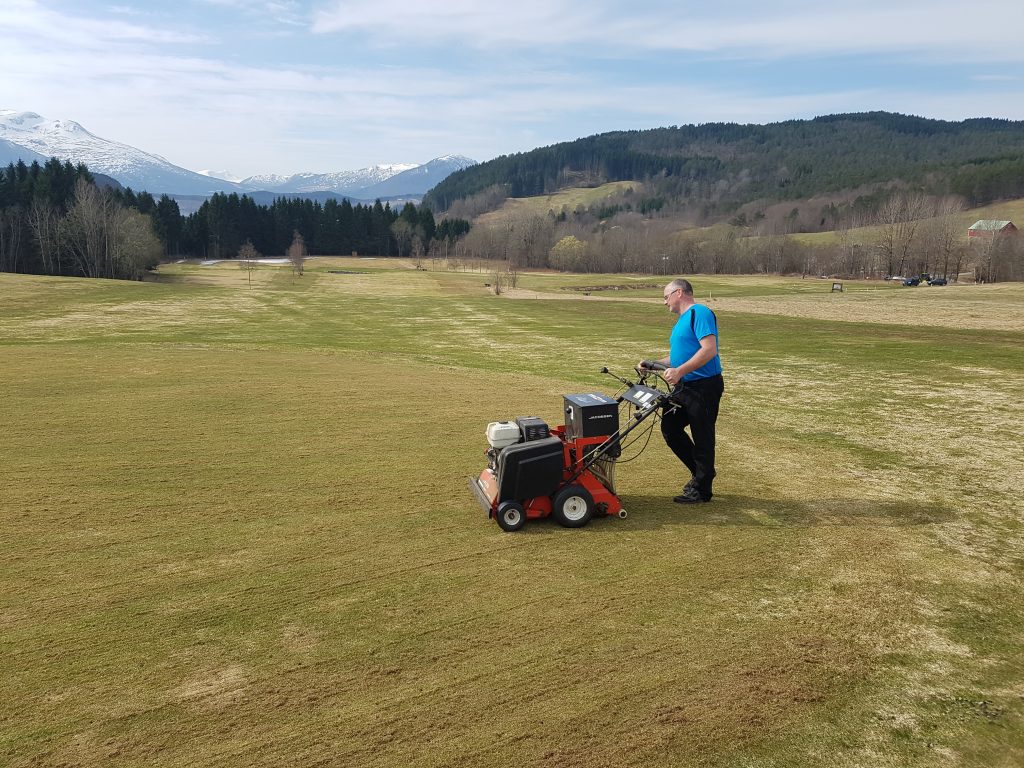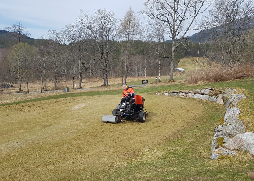 Langfredag var det stor aktivitet på golfbanen, med dressing, vertikalskjæring og resåing av greener, raking av fairwayer mv. De aller fleste greenene er nå klare for spill – og ser kjempefine ut årstiden tatt i betraktning.