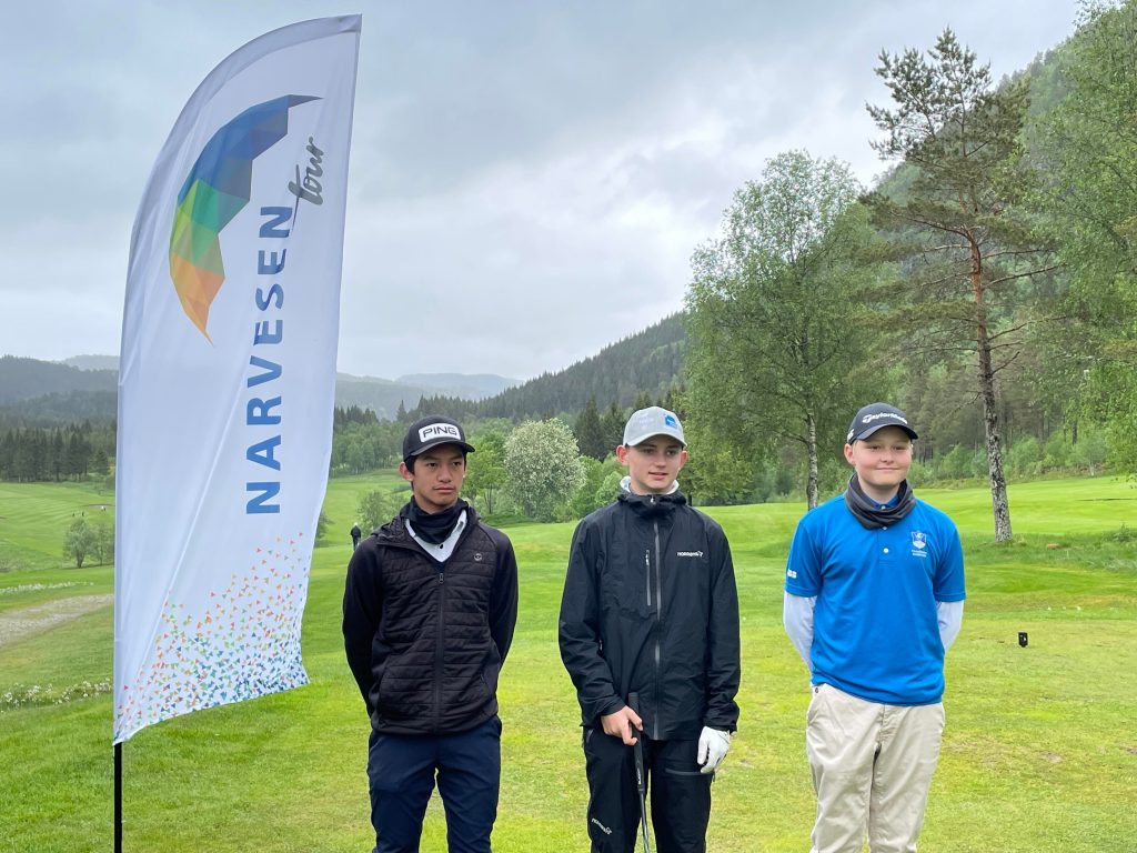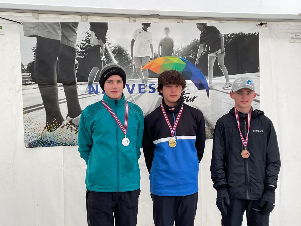 Her de tre beste i klasse G13-15 år, fra venstre Simon Storsten Dahl (Ålesund GK), Frederik Richardson (Trondheim GK) og Marius Kvande (Surnadal GK) som fikk henholdsvis sølv, gull og bronse i bruttoslag-konkurransen.