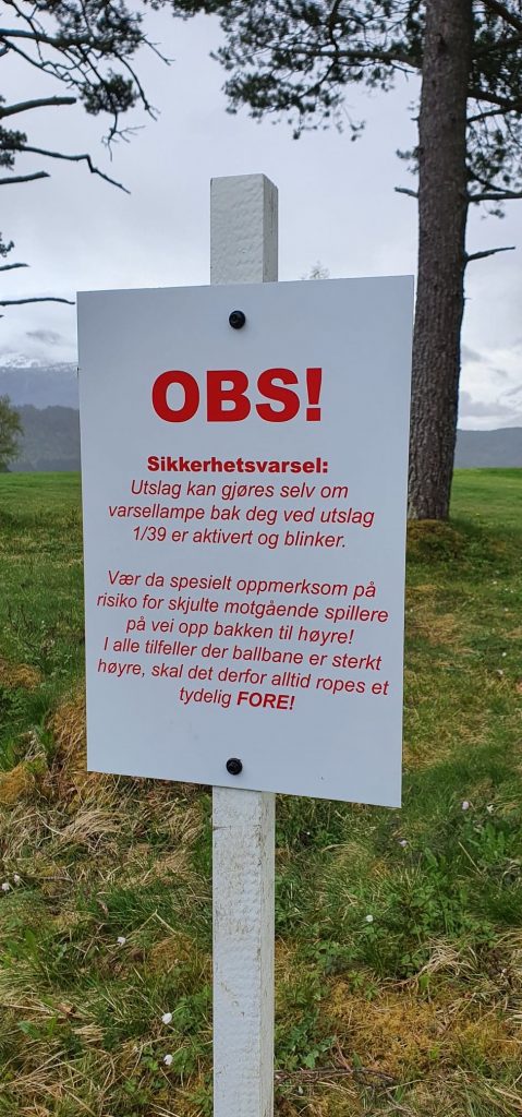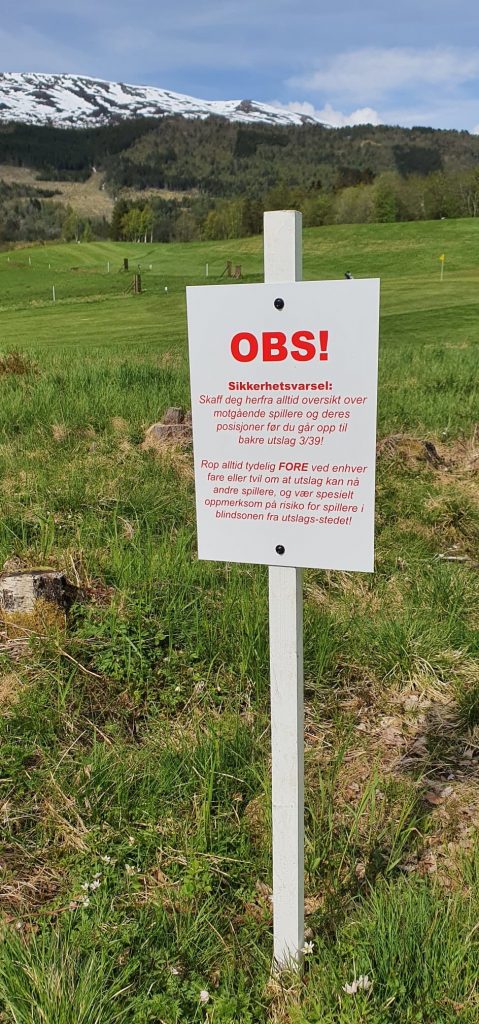 Og når du kommer til hull 3 er det også kommet opp et nytt skilt. Vær særlig forsiktig med sikkerheten på dette hullet. Når du slår ut fra hull 3 (altså det bakerste utslaget) er det vanskelig å se ned i bakken på hull 3 og hull 6. Skaff deg derfor nødvendig oversikt over mulige farer (spillere på banen) FØR du slår ut.