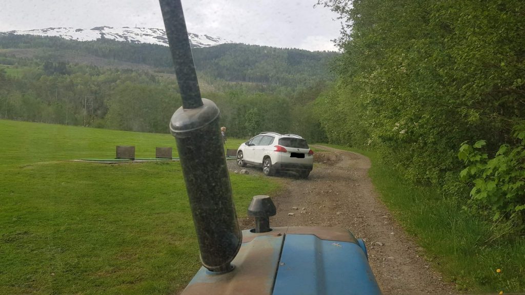 Dette gjelder også ved drivingrangen, der vi må unngå parkere slik at det ikke er mulig å passere for en traktor med bredt utstyr. Så helst ikke parkere slik som på bildet.