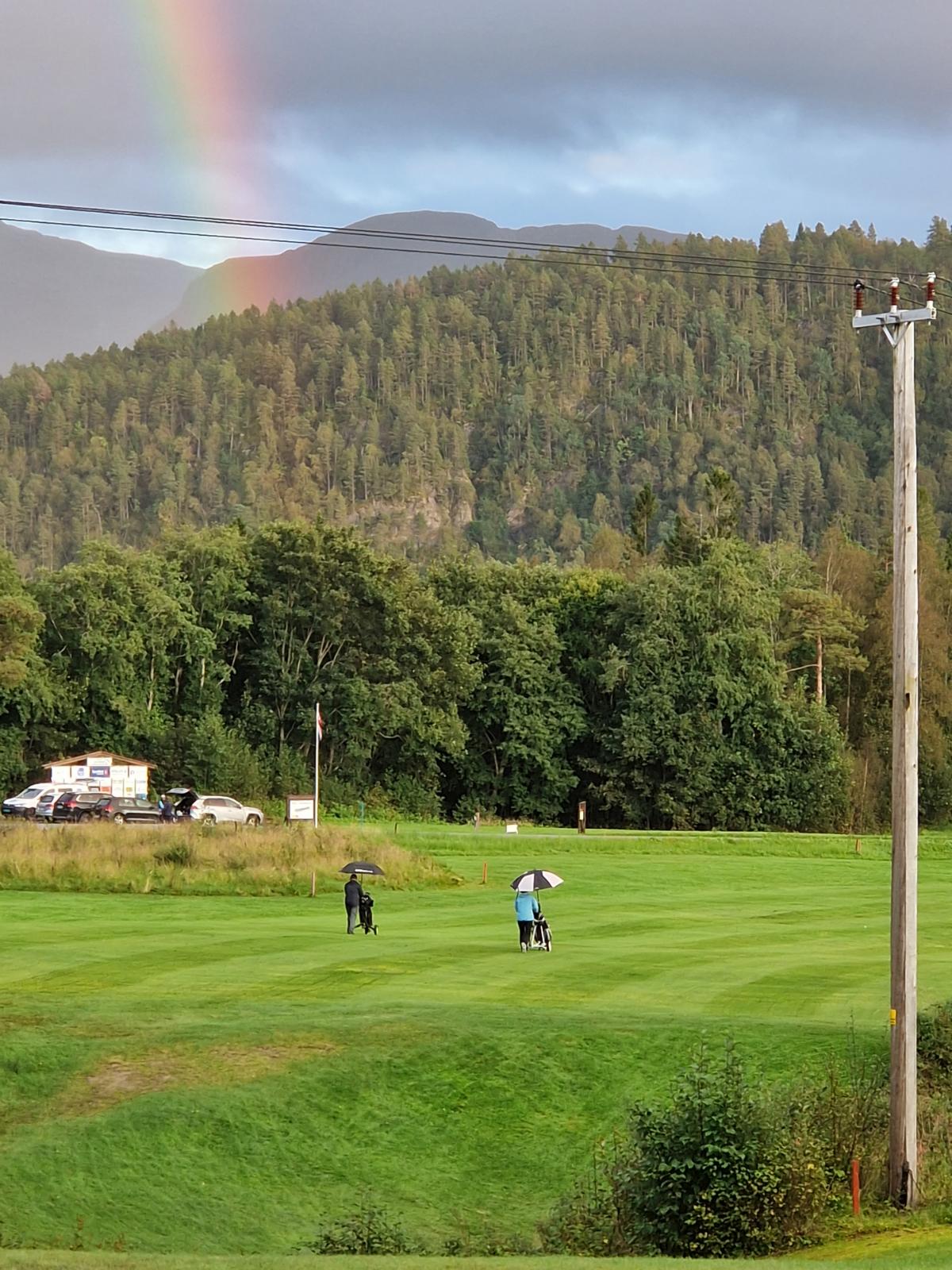 Vekselvis paraplyvær og sol – og dermed en fin regnbue ned mot hull 9 🙂 Foto: Øyvind Svinvik