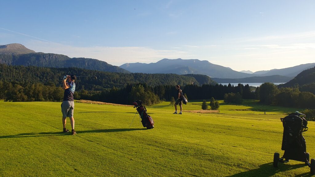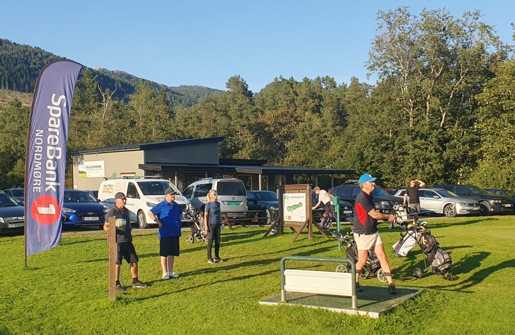 Det var en nydelig sensommerkveld på Surnadal Golfpark onsdag 27. august. Her med Erkki Morten Klami og Torgeir Kvendset som «fotomodeller» på hull 1.