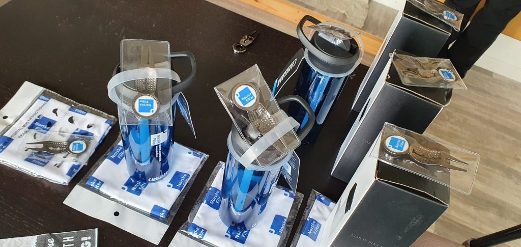 Klubbens nye sponsor Norske Filter AS (ved Tor Oterhals) stilte med flotte premier til turneringen (og til klubbens premielager til senere turneringer).  Her var det både termoskopper, drikkeflasker, buffer og greengafler.  Surnadal GK takker hjertelig for supert bidrag til turneringen og klubben 🙂