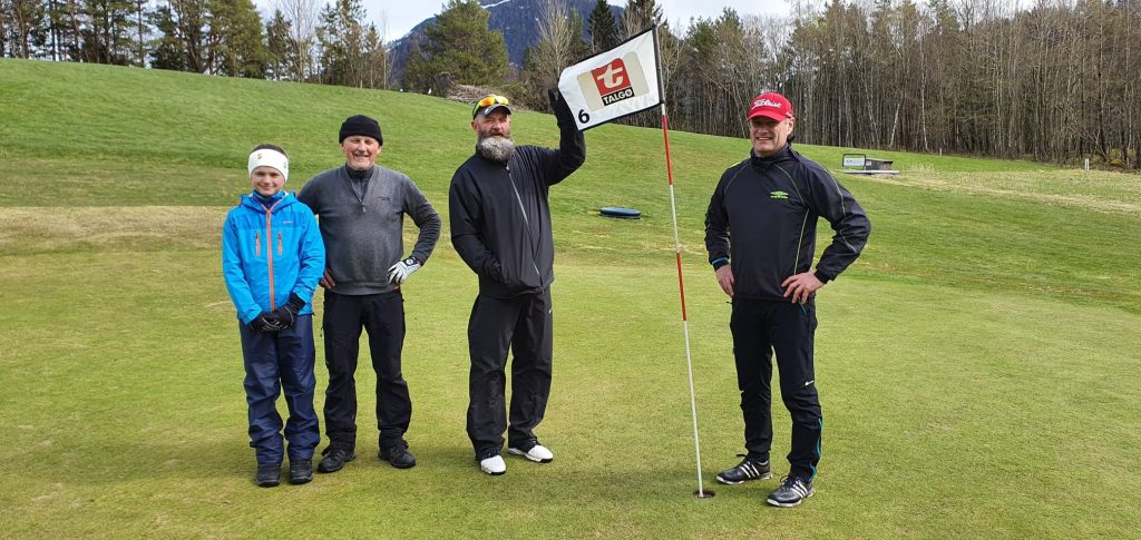 Her ser vi noen av deltakerne i dagens turnering.  Fra venstre Marius Kvande (caddie for bestefar), Terje Kvande, Stig Talgø og Magnus Snekvik samlet på green 6.   Terje og Magnus spilte jevnt godt hele runden, mens Stig og fotografen inntok nederste del av resultatlista…..