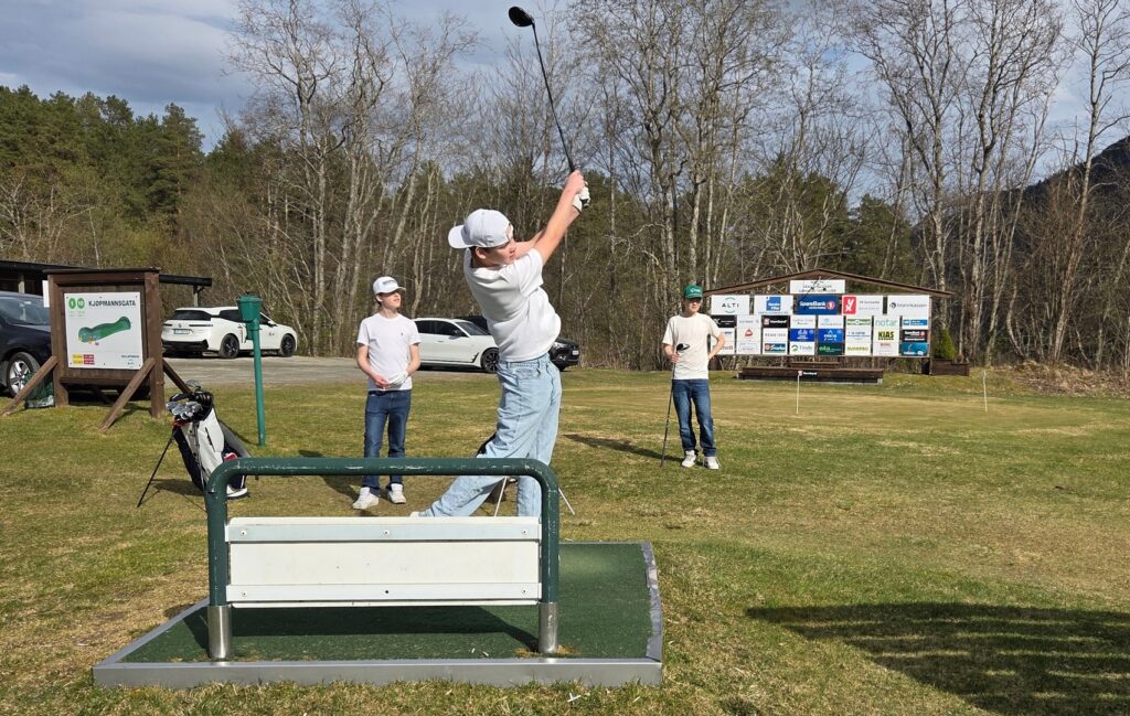 Her er det Luca som slår ut på hull 1, mens kompisene Trond og Ralfs venter i bakgrunnen. Både Luca og Ralfs tok kurset i fjor, og skal nå snart prøve seg i turneringer framover, som f.eks. Olyo JuniorTour lørdag 16. mai. Trond er påmeldt til årets andre nybegynnerkurs, og gleder seg til å bli «godkjent» som ekte golfspiller.