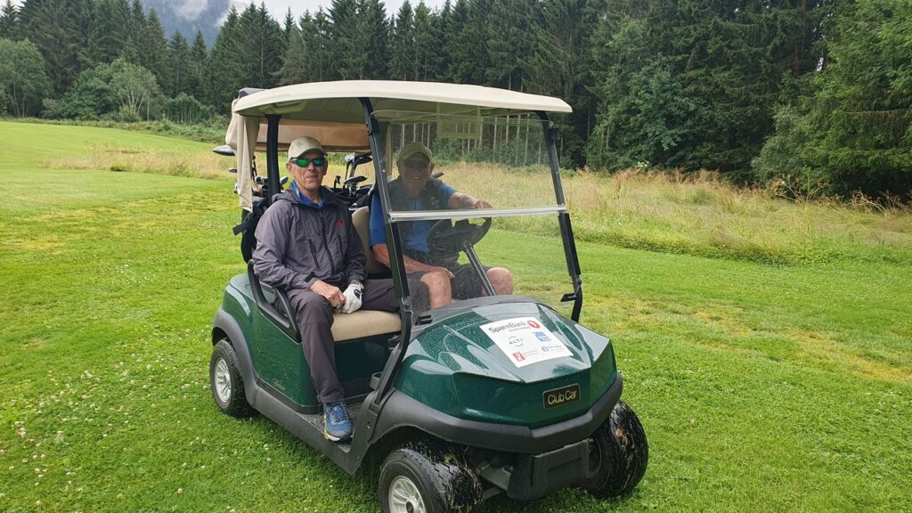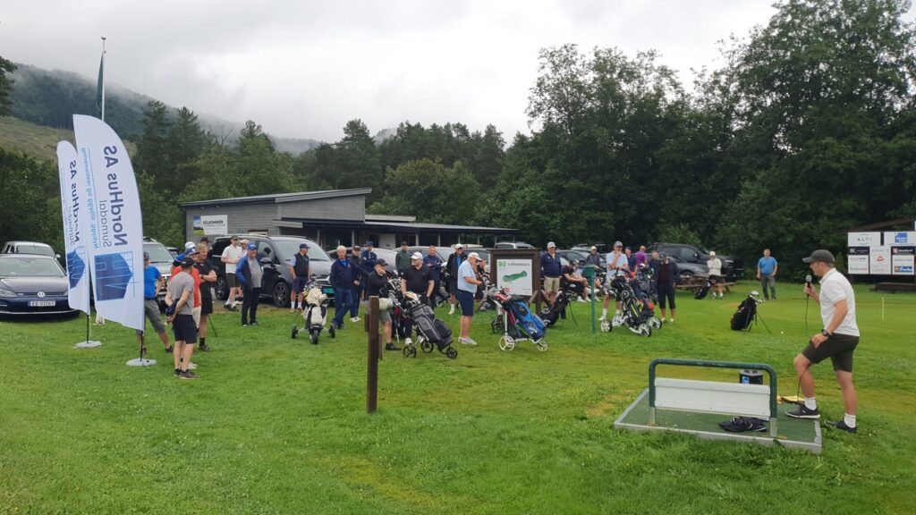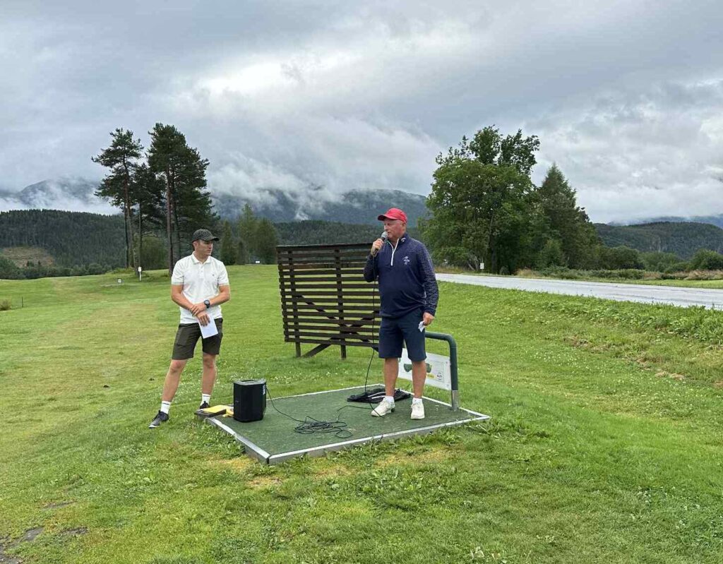 Kristoffer Brøske Nordvik fra NordHus AS og turneringsleder Knut Haugen orienterer om turneringen, premiering, spilleform og regler før start. Irish Greensome er en spennende spilleform, der begge spillerne i paret slår ut fra tee, og på par 4-hull enda et slag på makkerens ball, før en av ballene blir valgt for fullføring av hullet med annethvert slag.