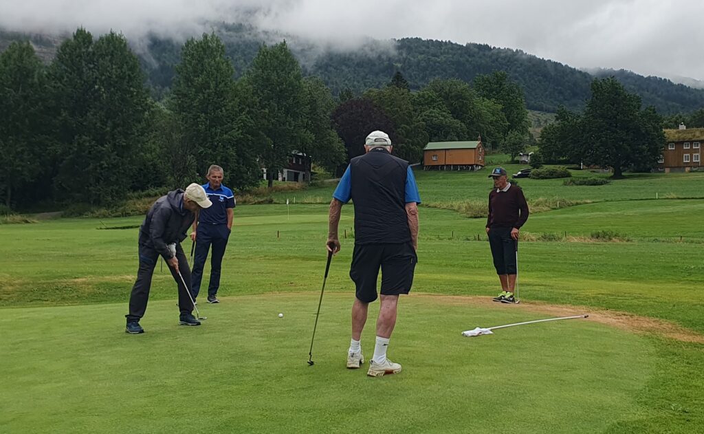 Dette er vel å betrakte som dagens «seniorflight». Trygve Talgø (89) putter mens lagkamerat Kjell Øyen (85) står med ryggen til. Hallvard Kvande (75) og Nils Magne Røen (73) er som ungdommer å regne sammenlignet med de to førstnevnte 🙂