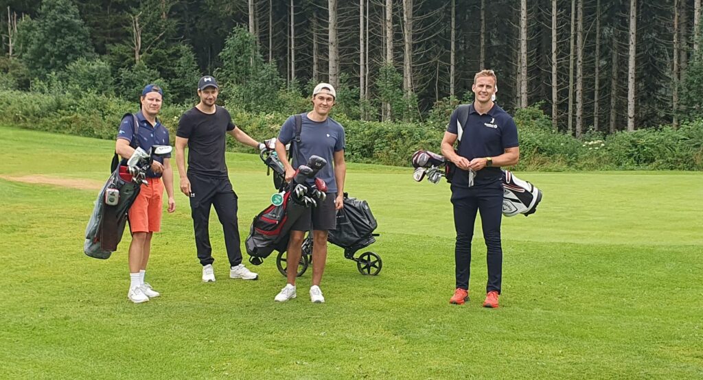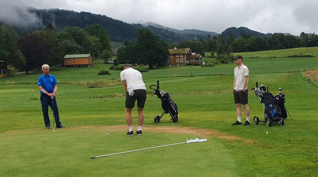 Duoen Kristoffer Brøske Nordvik og Henrik Melkild åpnet meget godt i dagens turnering, og ledet lenge ganske klart – før det ble litt tyngre på slutten og det endte med 3. plass. Her setter Kristoffer birdieputten på hull 5, mens Bjørn Schei og lagkamerat Henrik Melkild følger spent med.