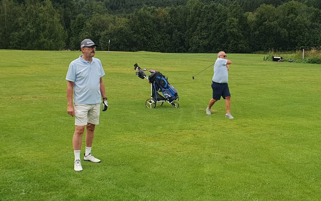 Arthur Melling slår sitt andreslag på hull 6, mens Ole Bævre følger med.
