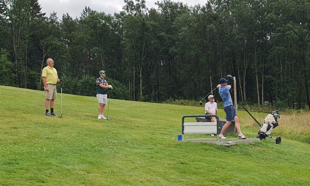 Kristian Tvedt fra Sunndal GK slår ut på hull 3, med Geir Berntsen, Jens Bjørbekk og Stig Talgø som tilskuere.