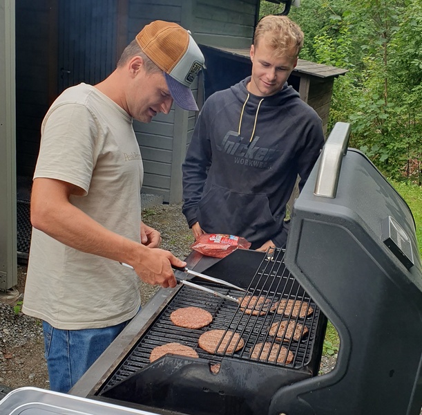 Grillkokkene Jonas Holten og Vegard Gjul sørger for burgere til deltakerne i NordHus Irish Greensome.