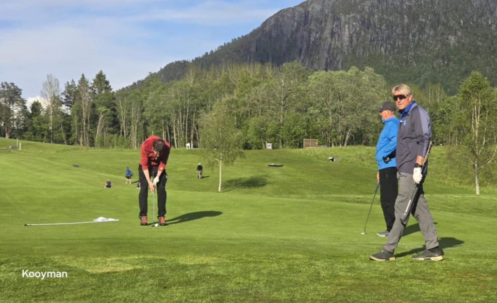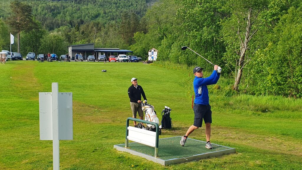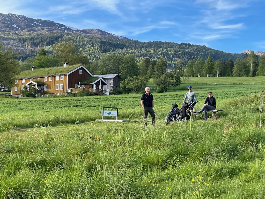 Fin golfkveld på Surnadal Golfpark. Her med den flotte gårdsbygningen på Mo i bakgrunnen, og trioen Knut Haugen, Stian Kooyman og Torgeir Kvendset ved utslaget på hull 14.