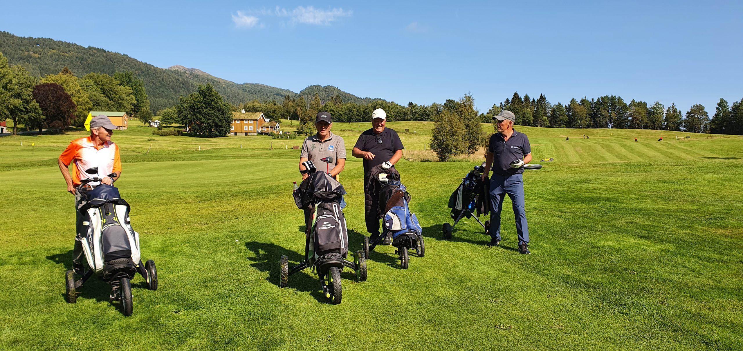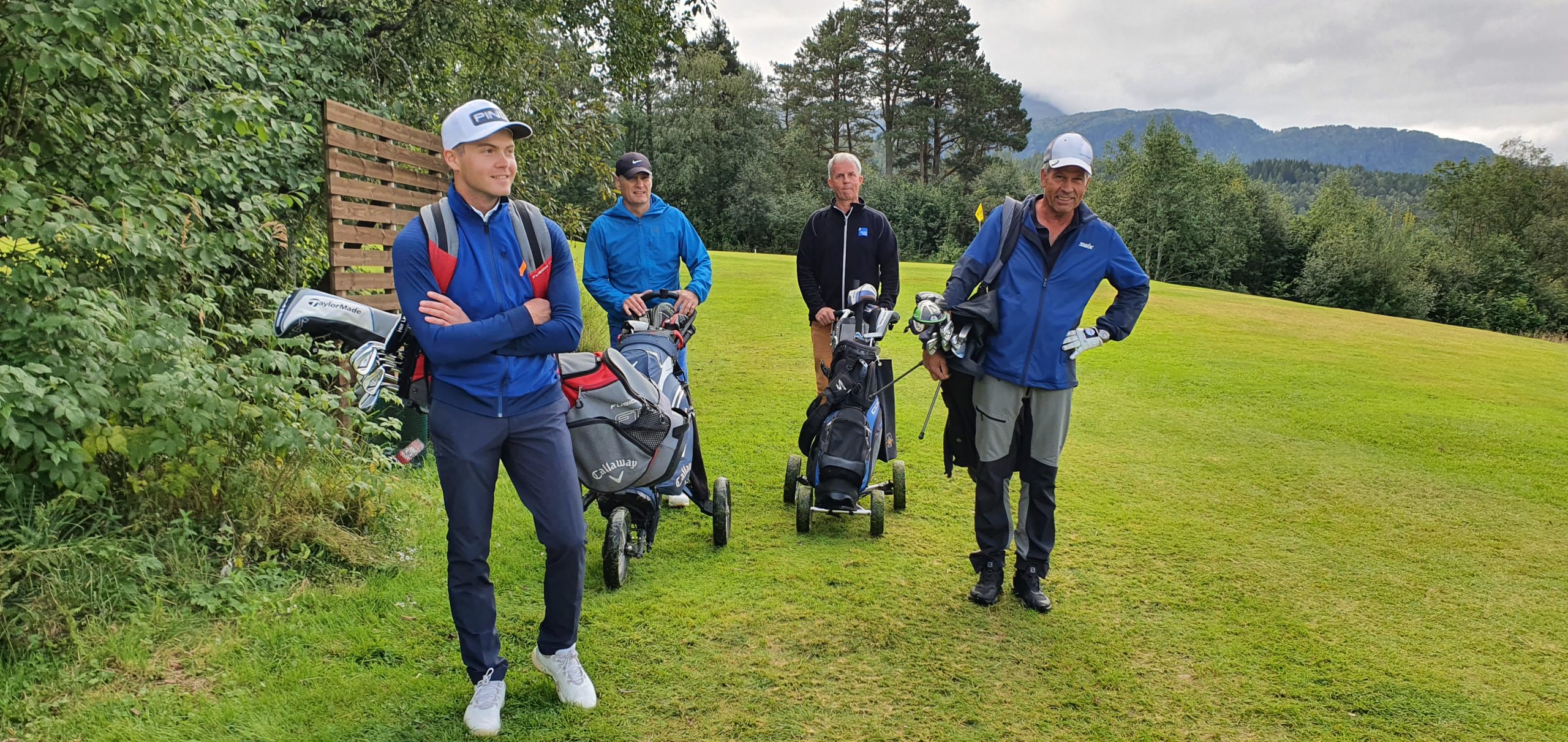 Torstein Snekvik (til venstre) spilte en god runde søndag, og vant den prestisjetunge familie-konkurransen mot far Magnus med knappest mulig margin (163 vs 164 slag). Her sammen med dagens medspillere Bjørn Schei og Jørn Einar Bjørnaas.
